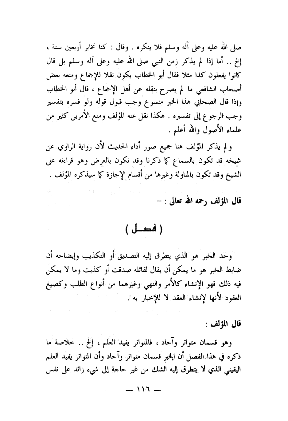 وهو قسمان متواتر وآحاد، فالمتواتر يفيد العلم، الخ..