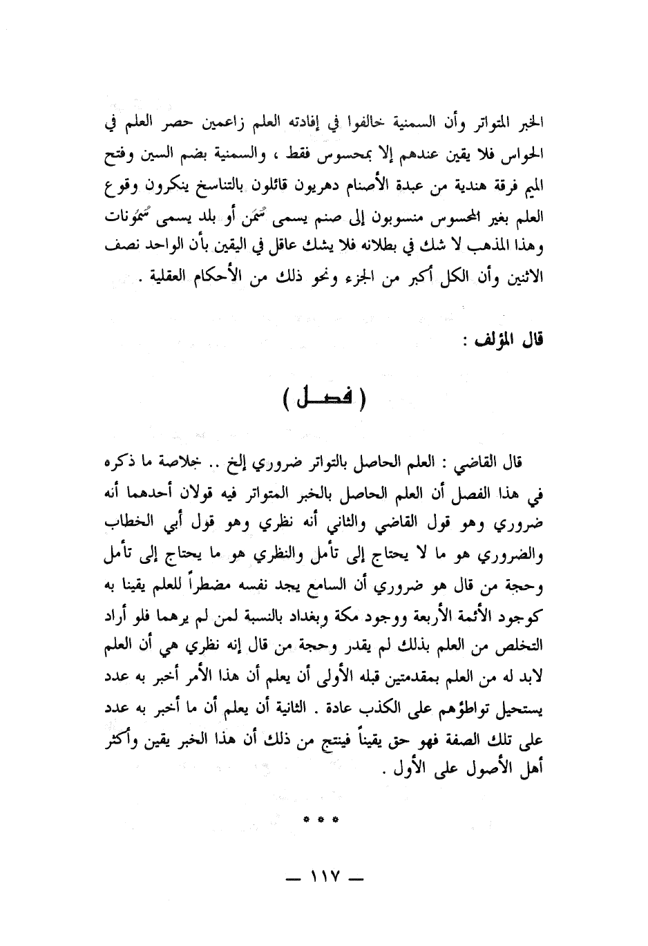 قال القاضي: العلم الحاصل بالتواتر ضروري الخ.. خلاصة ما ذكره في هذا الفصل ان العلم الحاصل بالخبر المتواتر فيه قولان أحدهما أنه ضروري وهو قول القاضي والثاني أنه نظري وهو قول أبي الخطاب والضروري هو مالا يحتاج إلى تأمل والنظري هو ما يحتاج إلى تأمل وحجة من قال هو ضروري أن السامع يجد نفسه مضطراً للعلم يقيناً به كوجود الائمة الأربعة ووجود مكة وبغداد بالنسبة لمن لم يرهما فلو أراد التخلص من العلم بذلك لم يقدر وحجة من قال انه نظري هي أن العلم لابد