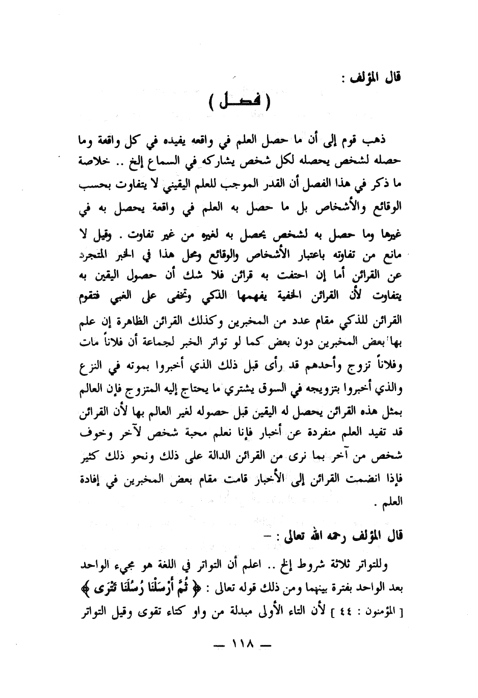 ذهب قوم الى أن ما حصل العلم في واقعة يفيده في كل واقعة وما حصله لشخص يحصله لكل شخص يشاركه في السماع الخ ... خلاصة ما ذكر في هذا الفصل أن القدر الموجب للعلم اليقيني لا يتفاوت بحب الوقائع والأشخاص بل ما حصل به العلم في واقعة يحصل به في..