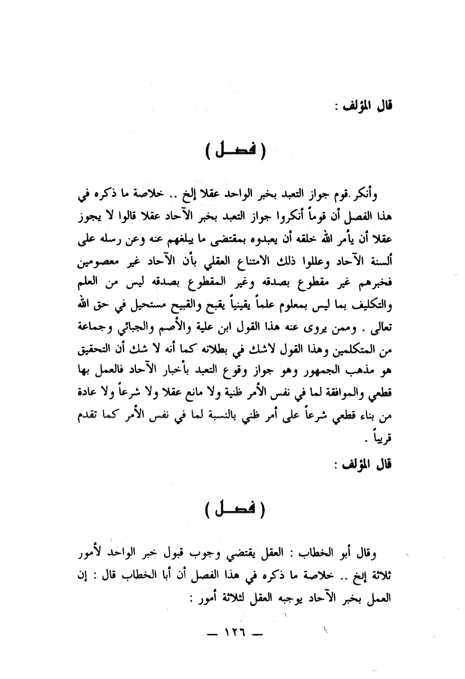 وقال أبو الخطاب: العقل يقتضي وجوب قبول خبر الواحد لأمور ثلاثة الخ ... خلاصة ما ذكره في هذا الفصل ان أبا الخطاب قال: ان العمل بخبر الآحاد يوجبه العقل لثلاثة أمور: