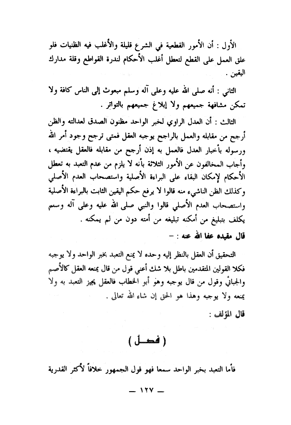 فأما التعبد بخبر الواحد سمعا فهو قول الجمهور خلافاً لأكثر القدرية وبعض أهل الظاهر ولنا دليلان قاطعان الخ ... خلاصة ما ذكره المؤلف في هذا الفصل أن التعبد بخبر الواحد بالنظر إلى الحكم الشرعي فهو مراده بقوله سمعا هو مذهب الجمهور خلافاً لأكثر القدرية