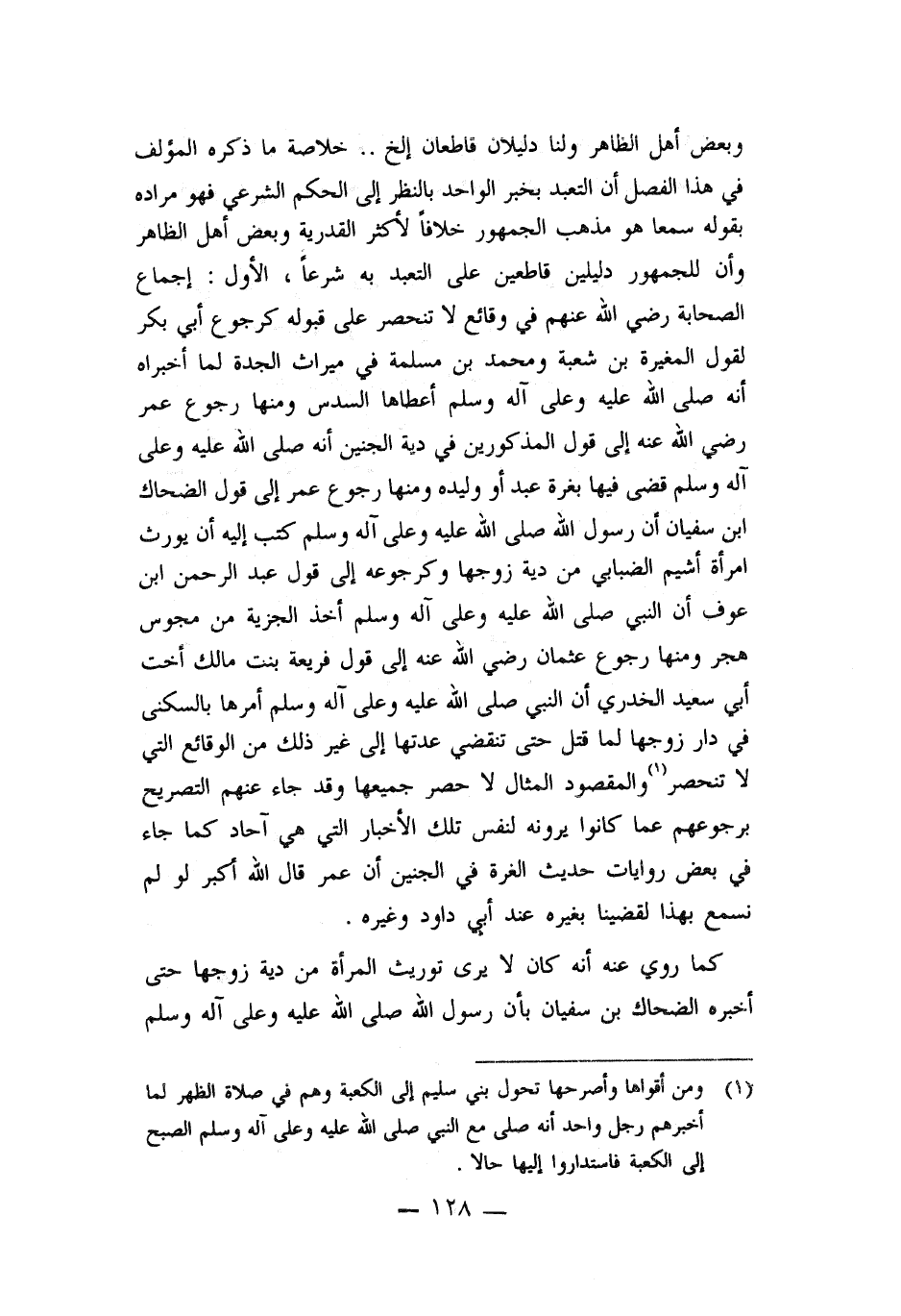 وبعض أهل الظاهر وان للجمهور دليلين قاطعين على التعبد به شرعاً , الأول: إجماع الصحابة رضي الله عنهم في وقائع لا تنحصر على قبوله كرجوع أبي بكر لقول المغيرة ابن شعبة ومحمد بن سلمة في ميراث الجدة لما أخبراه أنه صلى الله عليه وسلم أعطاها السدس ومنها رجوع عمر