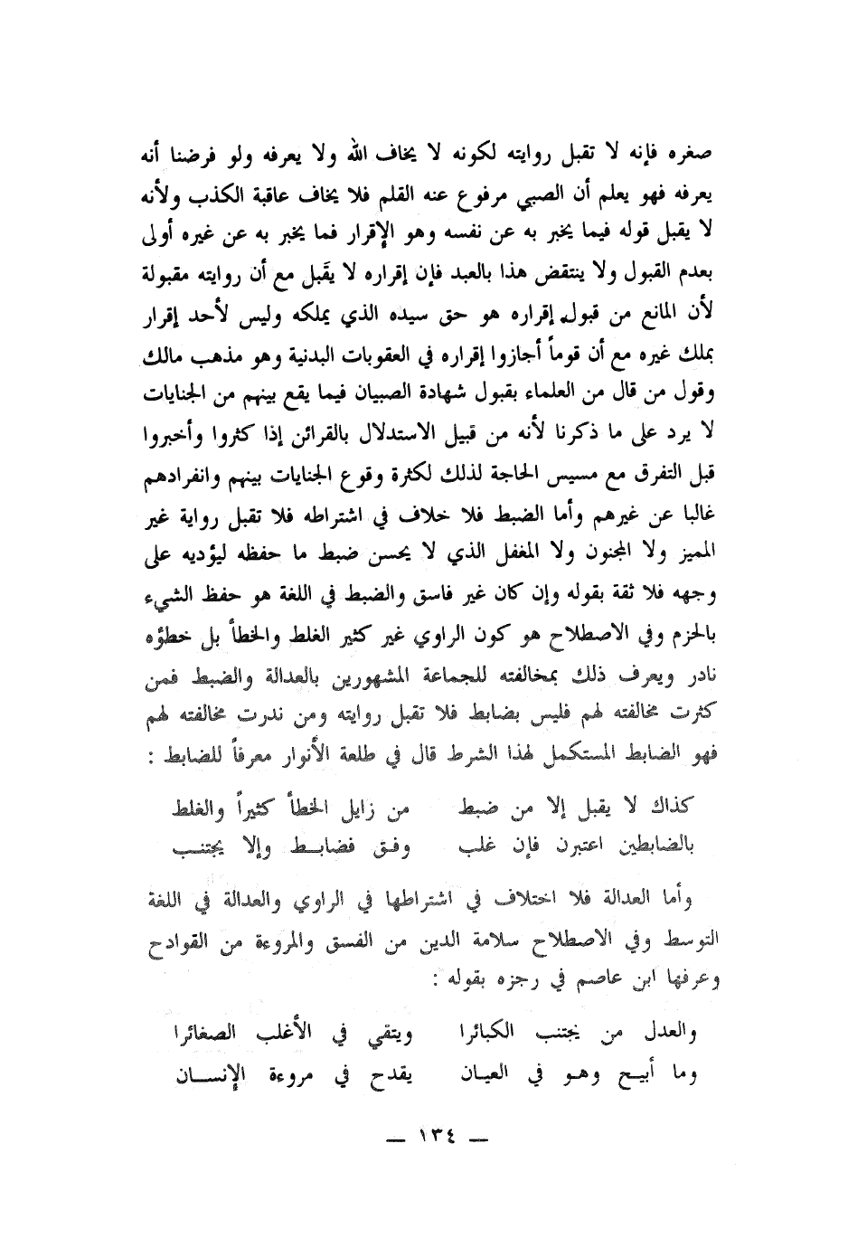 وأما العدالة فلا اختلاف في اشتراطها في الراوي والعدالة في اللغة التوسط وفي الاصطلاح سلامة الدين من الفسق والمروءة من القوادح وعرفها ابن عاصم في رجزه بقوله: