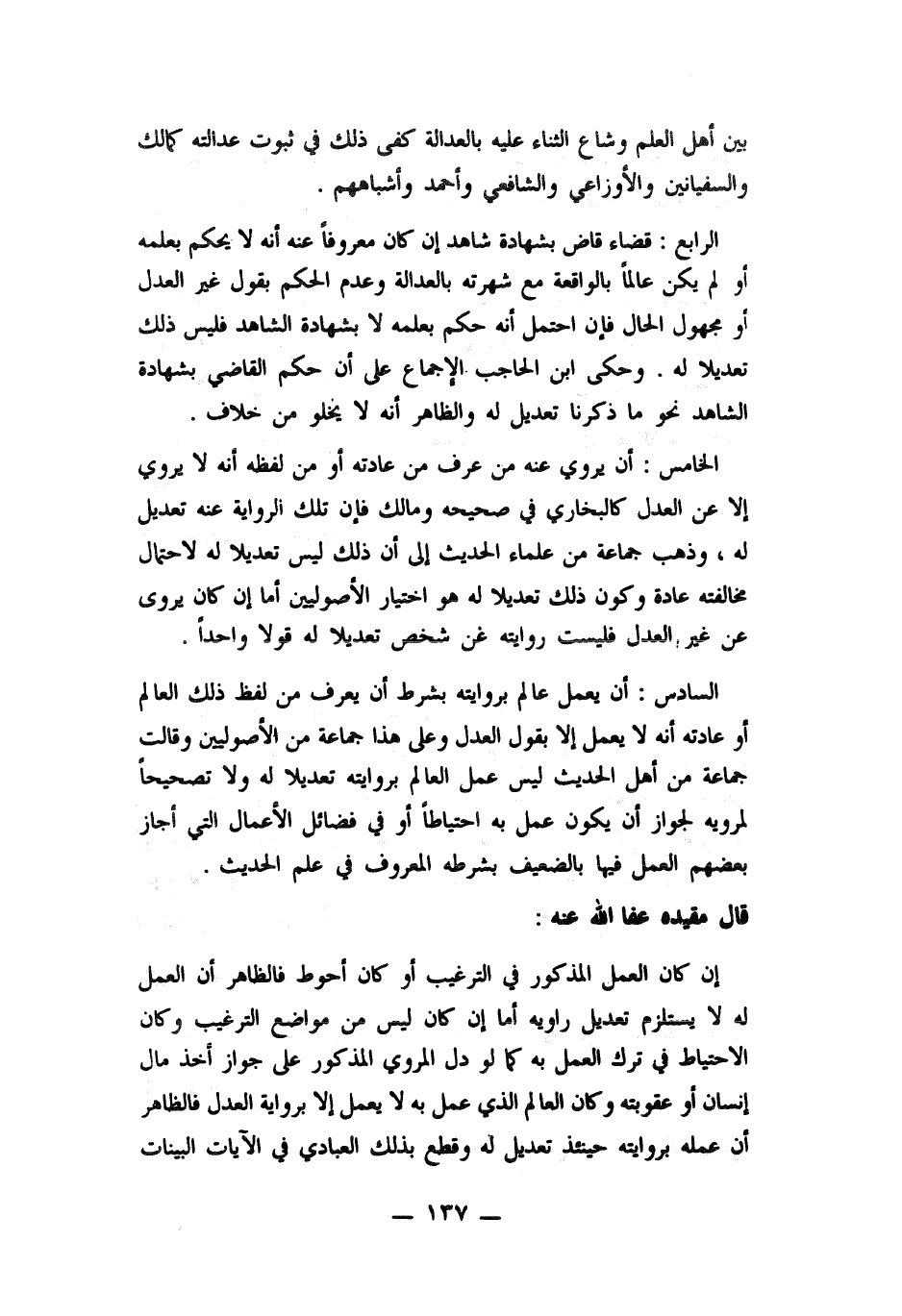 الخامس: أن يروي عنه من عرف من عادته أو من لفظه أنه لا يروى الا عن العدل كالبخاري في صحيحه ومالك فان تلك الرواية عنه تعديل له , وذهب جماعة من علماء الحديث إلى أن ذلك ليس تعديلا له لاحتمال مخالفته عادة وكونه ذلك تعديلا له هو اختيار الأصوليين أما ان كان يروى عن غير العدل فليست روايته عن شخص تعديلا له قولا واحدا.