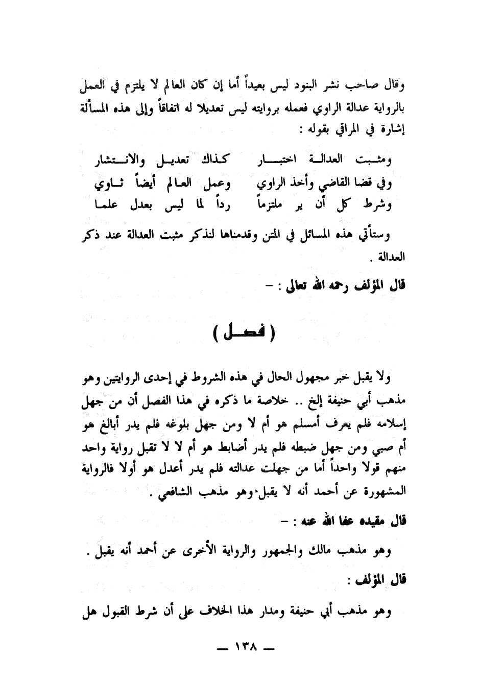 ولا يقبل خبر مجهول الحال في هذه الشروط في احدى الروايتين وهو مذهب أبي حنيفة الخ ... خلاصة ما ذكره في هذا الفصل أن من جهل إسلامه فلم يعرف أمسلم هو لا ومن جهل بلوغه فلم يدر أبالغ هو أم صبي ومن جهل ضبطه فلم يدر أضابط هو أم لا لا تقبل رواية واحد منهم قولا واحداً أما من جهلت عدالته فلم يدر أعدل هو أو لا فالرواية المشهورة عن أحمد أنه لا يقبل وهو مذهب الشافعي.