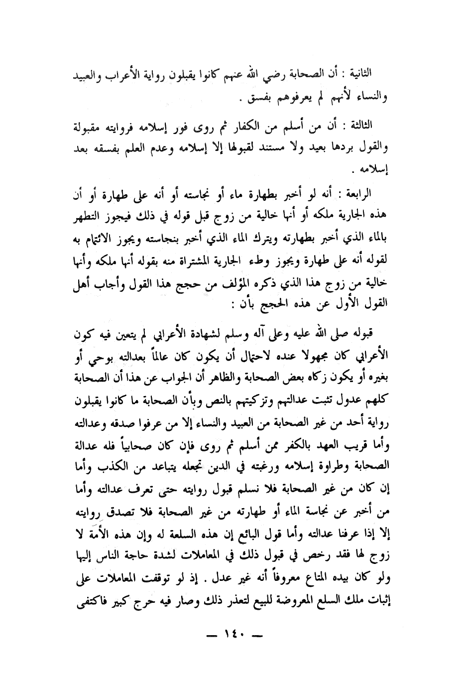 الثانية: ان الصحابة رضي الله عنهم كانوا يقبلون رواية الأعراب والعبيد والنساء لأنهم لم يعرفوهم بفسق. الثالثة: ان من أسلم من الكفار ثم روى فور إسلامه فروايته مقبولة والقول بردها بعيد ولا مستند لقبولها الا إسلامية وعدم العلم بفسقه بعد إسلامه. الرابعة: أنه لو أخبر بطهارة ماء أو نجاسته أو أنه على طهارة أو أن هذه الجارية ملكه أو أنها خالية من زوج قبل قوله في ذلك فيجوز التطهر بالماء الذي أخبر بطهارته ويترك الماء الذي أخبر بنجاسته ويجوز الائتمام به لقوله أنه على طهارة ويجوز وطئ الجارية المشتراة
