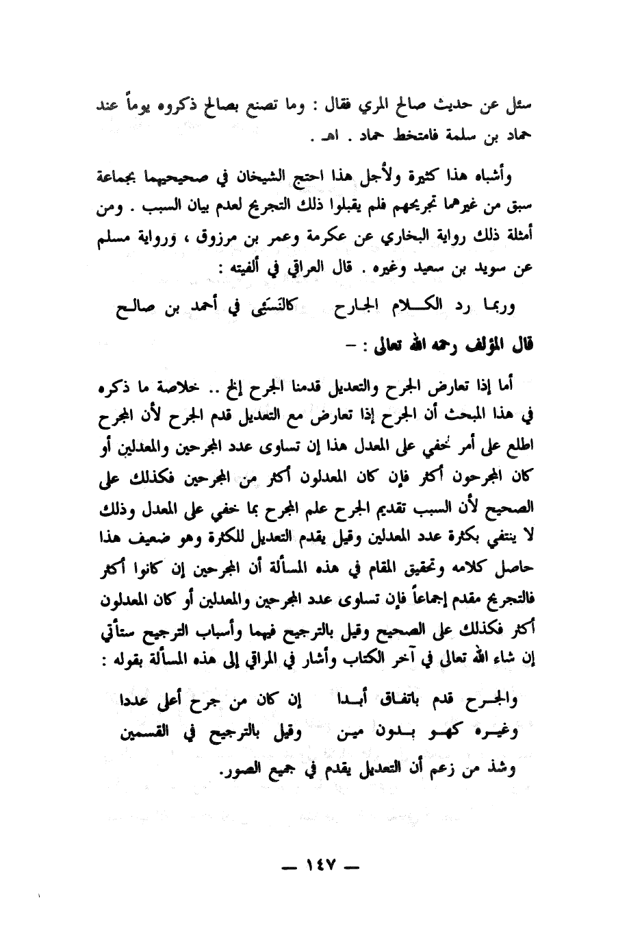 أما اذا تعارض الجرح والتعديل قدمنا الجرح الخ ... خلاصة ما ذكره في هذا المبحث أن الجرح اذا تعارض مع التعديل قدم الجرح لأن المجرح اطلع على أمر خفي على المعدل هذا ان تساوي عدد المجرحين والمعدلين أو كان المجرحون أكثر فان كان المعدلون أكثر