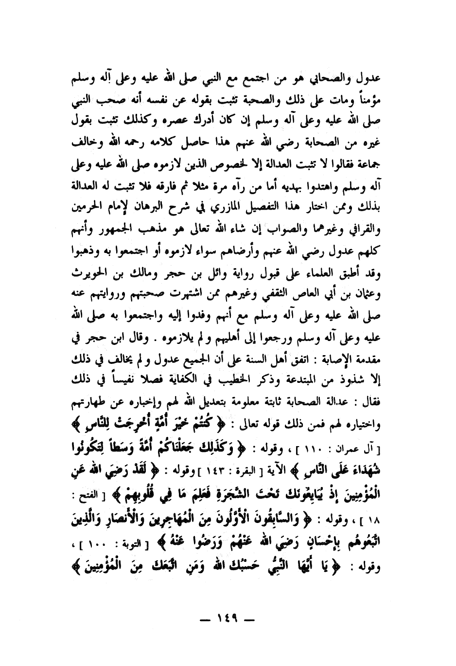 سواء لازموه أو اجتمعوا به وذهبوا وقد أطبق العلماء على قبول رواية وائل ابن حجر ومالك بن الحويرث وعثمان بن أبي العاص الثقفي وغيرهم ممن اشتهرت صحبتهم وروايتهم عنه صلى الله عليه وسلم مع أنهم وفدوا إليه واجتمعوا به صلى الله عليه وسلم ورجعوا إلى أهليهم ولم يلازموه. وقال ابن حجر في مقدمة الإصابة: اتفق أهل السنة على أن الجميع عدول ولم يخالف في ذلك الا شذوذ من المبتدعة وذكر الخطيب في الكفاية فصلا نفيساً في ذلك فقال: عدالة الصحابة ثابتة معلومة بتعديل الله لهم وأحباره عن طهارتهم واختياره لهم فمن ذلك