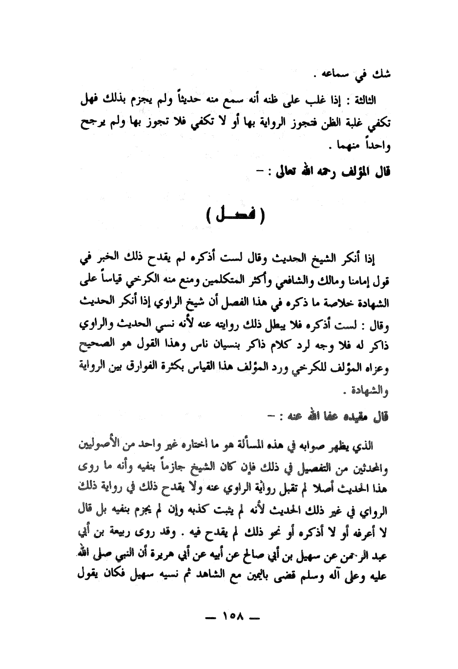 اذا أنكر الشيخ الحديث وقال لست أذكره لم يقدح ذلك الخبر في قول أم أمنا وما لك والشافعي وأكثر المتكلمين ومنع منه الكرخي قياساً على الشهادة خلاصة ما ذكره في هذا الفصل أن شيخ الراوي إذا أنكر الحديث وقال: لست أذكره فلا يبطل ذلك روايته عنه لأنه نسى الحديث والراوي ذاكر له فلا وجه لرد كلام ذاكر له فلا وجه لرد كلام ذاكر بنسيان ناس وهذا القول هو الصحيح وعزاه المؤلف للكرخي ورد المؤلف هذا القياس بكثرة الفوارق بين الرواية والشهادة.