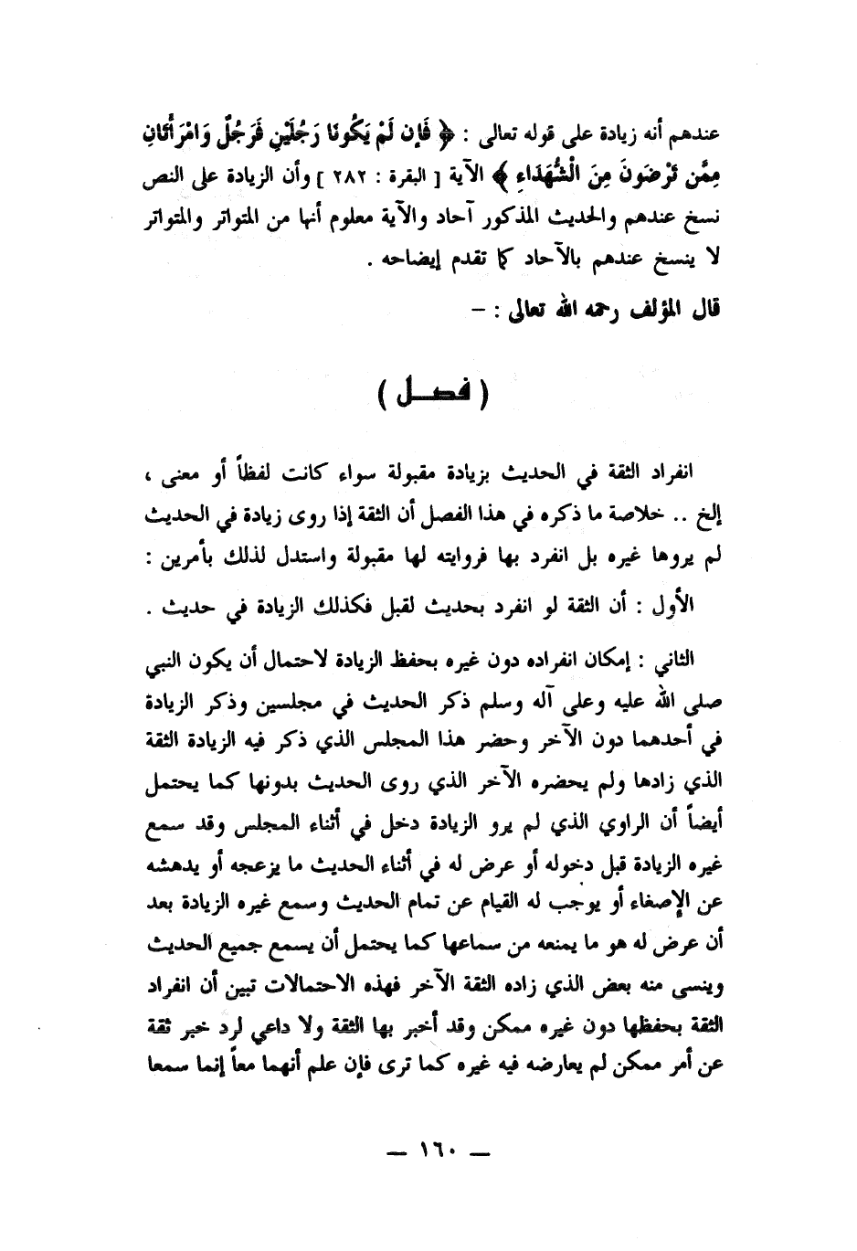 انفراد الثقة في الحديث بزيادة مقبول سواء كانت لفظاً أو معني , الخ ... خلاصة ما ذكره في هذا الفصل أن الثقة اذا روى زيادة في الحديث لم يروها غيره بل انفرد بها فروايته لها مقبولة واستدل لذلك بأمرين: