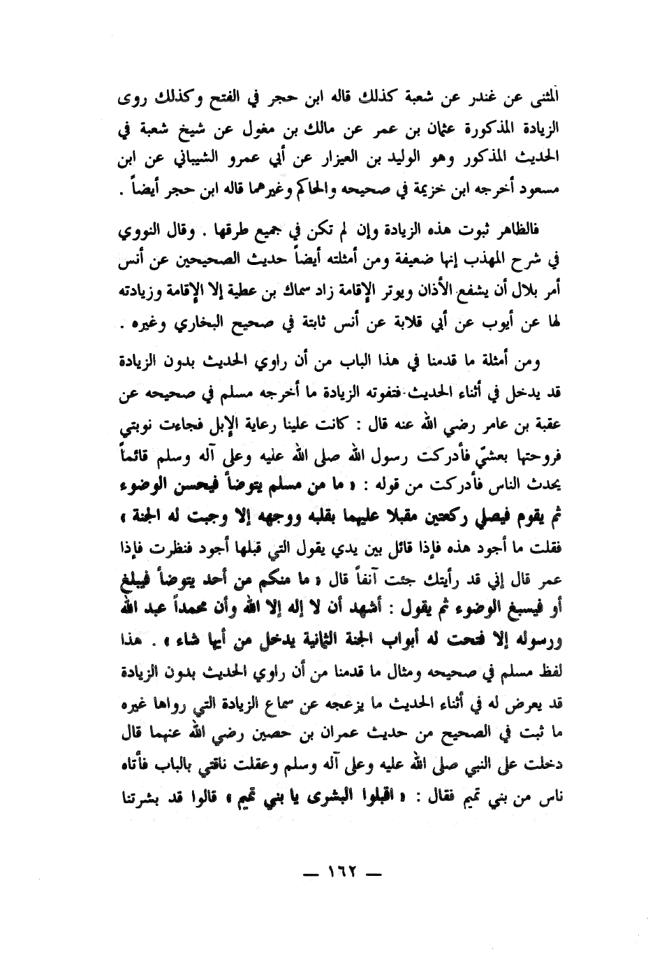 وقال النووي في شرح المهذب أنها ضعيفة ومن أمثلته أيضاً حديث الصحيحين عن أنس أمر بلال أن يشفع الآذان ويوتر الإقامة زاد سماك بن عطية الا الإقامة وزيادته لها عن أيوب عن أبي قلابة عن أنس ثابتة في صحيح البخاري وغيره. ومن أمثلة ما قدمنا في هذا الباب من أن راوي الحديث بدون الزيادة قد يدخل في أثناء الحديث فتفوته الزيادة ما أخرجه مسلم في صحيحه عن عقبة بن عامر رضي الله عنه قال: كانت علينا رعاية الابل فجاءت نوبتي فروحتها بعشر فأدركت رسول الله صلى الله عليه وسلم قائماً يحدث الناس فأدركت من قوله ما من مسلم