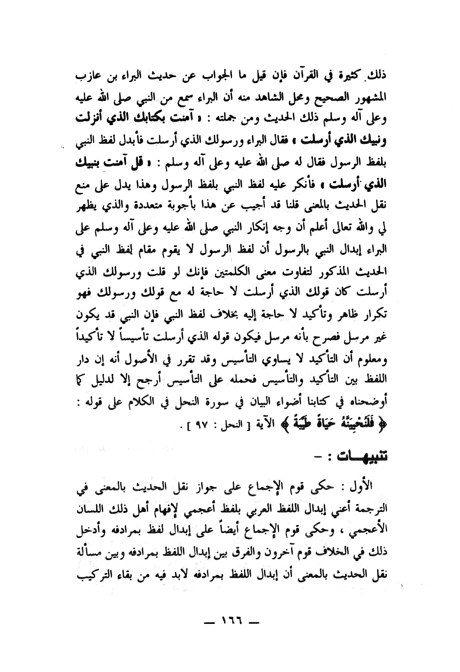 عليه وسلم ذلك الحديث ومن جملته آمنت بكتابك الذي أنزلت ونبيك الذي أرسلت فقال البراء ورسولك الذي أرسلت فأبدل لفظ النبي بلفظ الرسول فقال له صلى الله عليه وسلم: قال آمنت بنبيك الذي أرسلت، فأنكر عليه إبدال لفظ النبي بلفظ الرسول وهذا يدل على منع نقل الحديث بالمعنى قلنا قد أجيب عن هذا بأجوبة متعددة والذي يظهر لي والله تعالى أعلم أن وجه إنكار النبي صلى الله عليه وسلم على البراء إبدال النبي بالرسول إن لفظ الرسول لا يقوم مقام لفظ النبي في الحديث المذكور لتفاوت معنى الكلمتين فانك لو قلت ورسولك الذي
