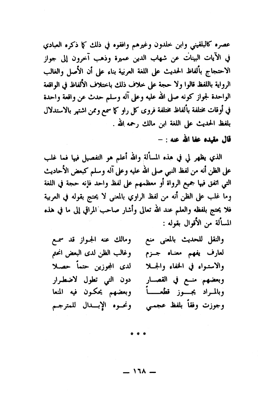عميرة وذهب آخرون إلى جواز الاحتجاج بألفاظ الحديث على اللغة العربية بناء على أن الأصل والغالب الرواية باللفظ قالوا ولا حجة على خلاف ذلك باختلاف الألفاظ في الواقعة الواحدة لجواز كونه صلى الله عليه وسلم حدث عن واقعة واحدة في أوقات مختلفة بألفاظ مختلفة فروى كل راو كما سمع وممن اشتهر بالاستدلال بلفظ الحديث على اللغة ابن مالك رحمه الله.