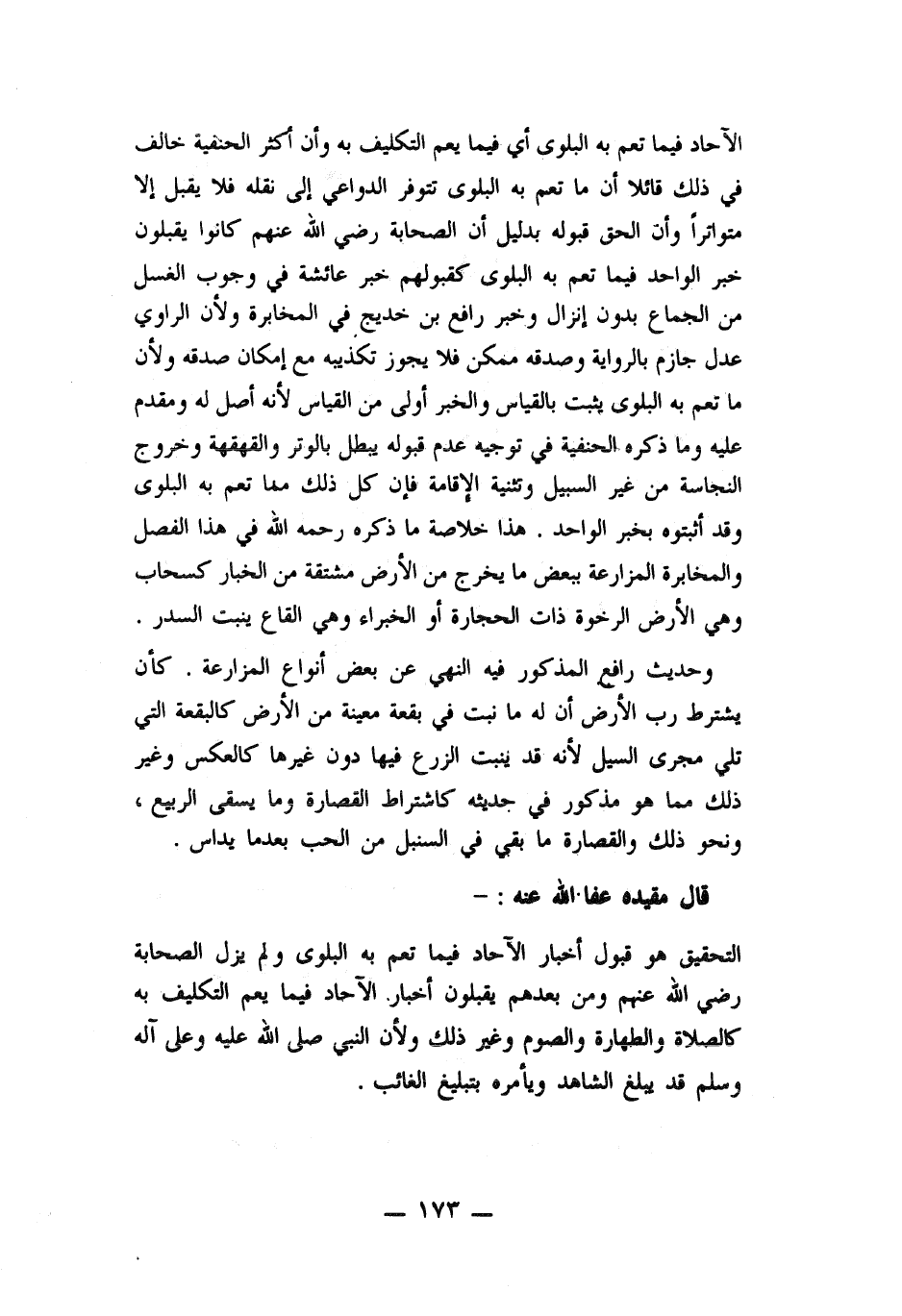 التحقيق هو قبول أخبار الآحاد فيما تعم به البلوى ولم يزل الصحابة رضي الله عنهم ومن بعدهم يقبلون أخبار الآحاد فيما يعم التكليف به كالصلاة والطهارة والصوم وغير ذلك ولأن النبي صلى الله عليه وسلم قد يبلغ الشاهد ويأمره بتبليغ الغائب.