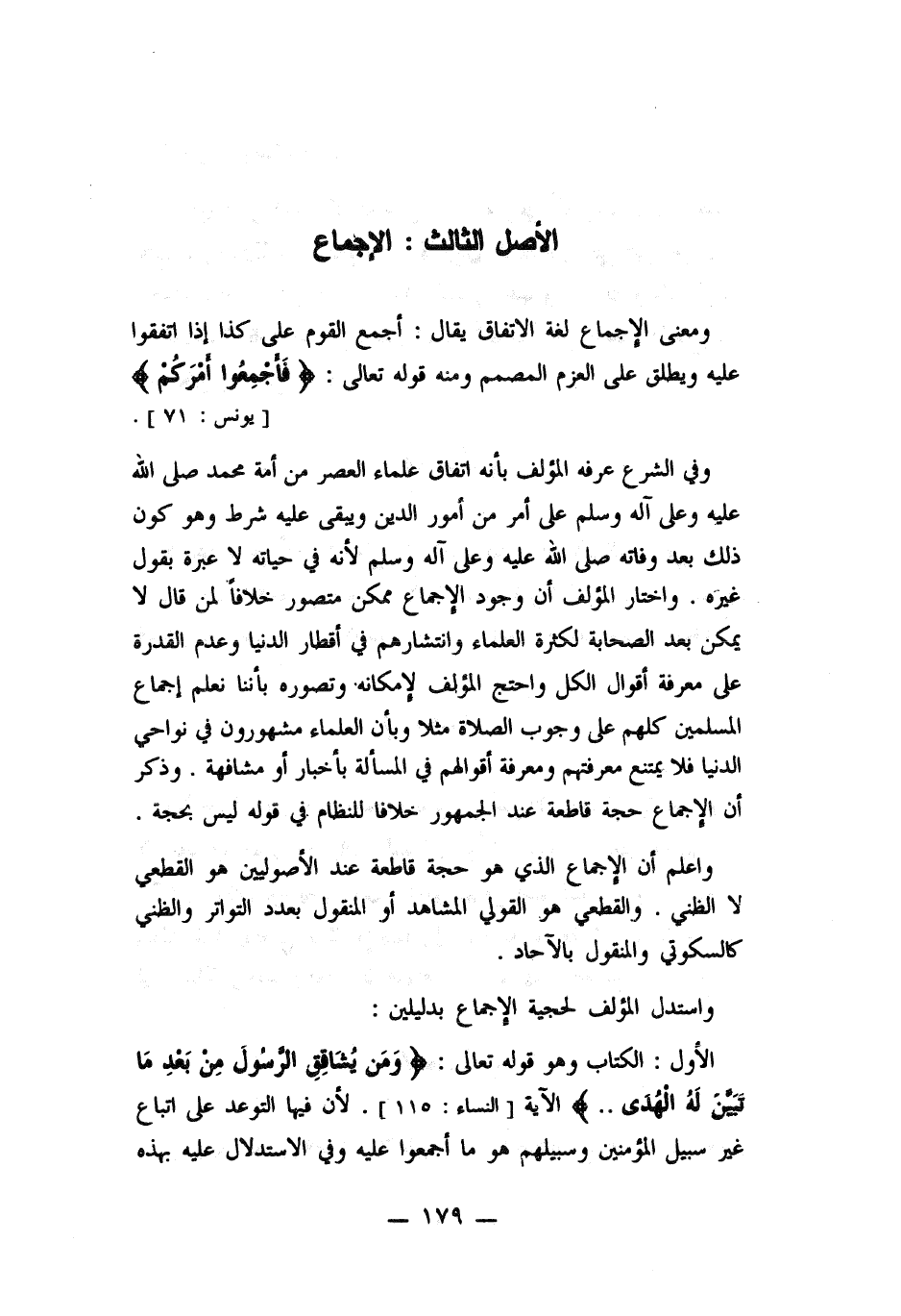 واستدل المؤلف لحجية الإجماع بدليلين: الأول الكتاب وهو قوله تعالى ((ومن يشاقق الرسول من بعد ما تبين له الهدى ... )) الآية. لأن فيها التوعد على اتباع غير سبيل المؤمنين وسبيلهم هو ما أجمعوا عليه وفي الاستدلال عليه بهذه