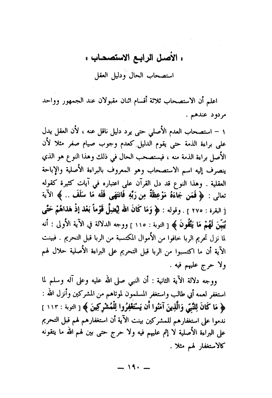 وقوله: ((وما كان الله ليضل قوما بعد اذ هداهم حتى بين لهم ما يتقون)) ووجه الدلالة في الآية الأولى انه لما نزل تحريم الربا خافوا من الأموال المكتسبة من الربا قبل التحريم. فبينت الآية ما اكتسبوا من الربا قبل التحريم على البراءة الأصلية حلال لهم ولا حرج عليهم فيه. ووجه دلالة الآية الثانية: ان النبي صلى الله عليه وسلم لما استغفر لعمه أبي طالب واستغفر المسلمون لموتاهم من المشركين وأنزل الله ما كان للنبي والذين آمنوا أن يستغفروا للمشركين ندموا على استغفارهم للمشركين بينت الآية أن استغفارهم لهم