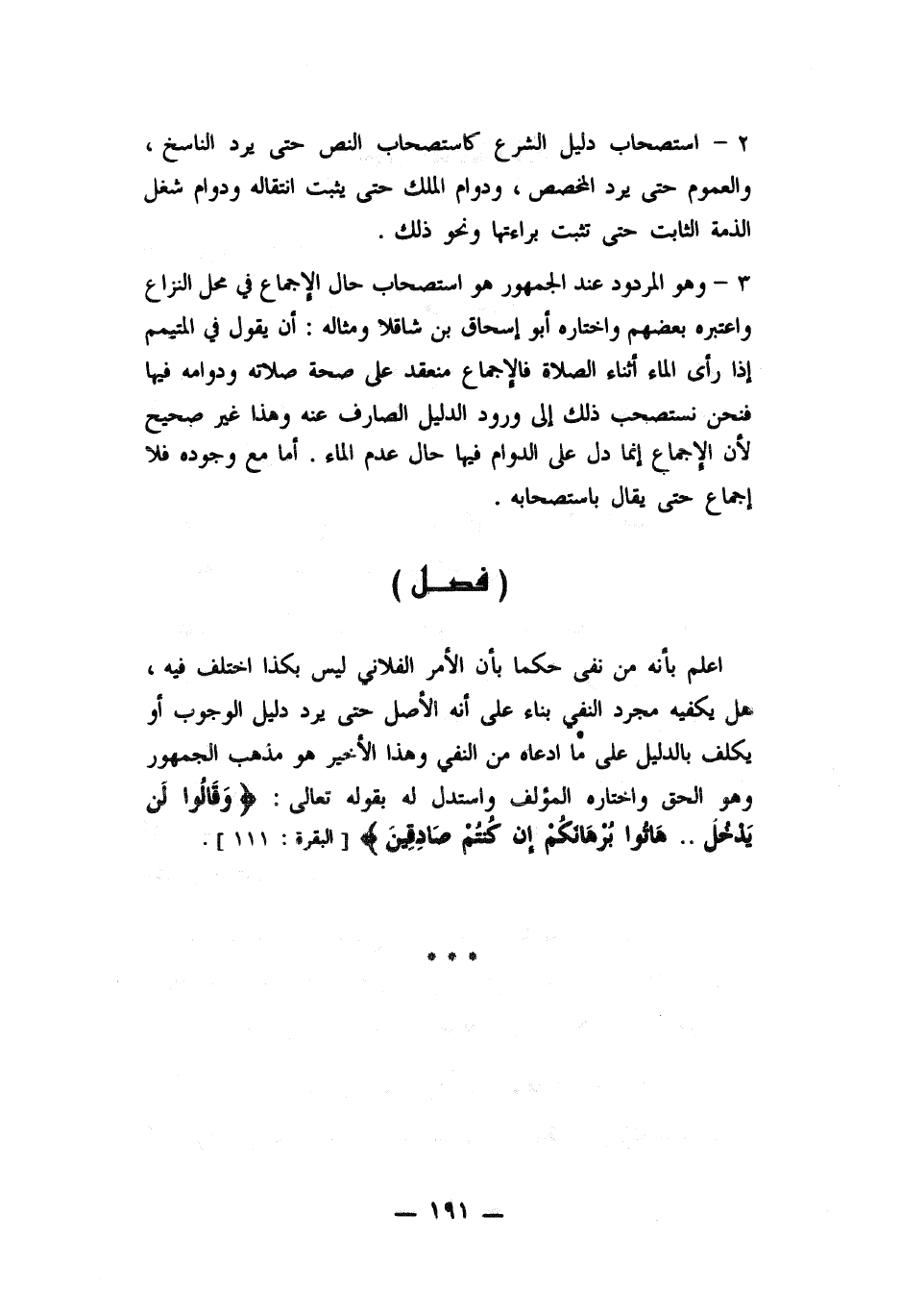 اعلم بأنه من نفى حكماً بأن الأمر الفلاني ليس بكذا اختلف فيه , هل يكفيه مجرد النفي بناء على انه الأصل حتى يرد دليل الوجوب أو يكلف بالدليل على ما ادعاه من النفي وهذا الأخير هو مذهب الجمهور وهو الحق واختاره المؤلف واستدل له بقوله تعالى: ((وقالوا لن يدخل ... هاتوا برهانكم ان كنتم صادقين)) .