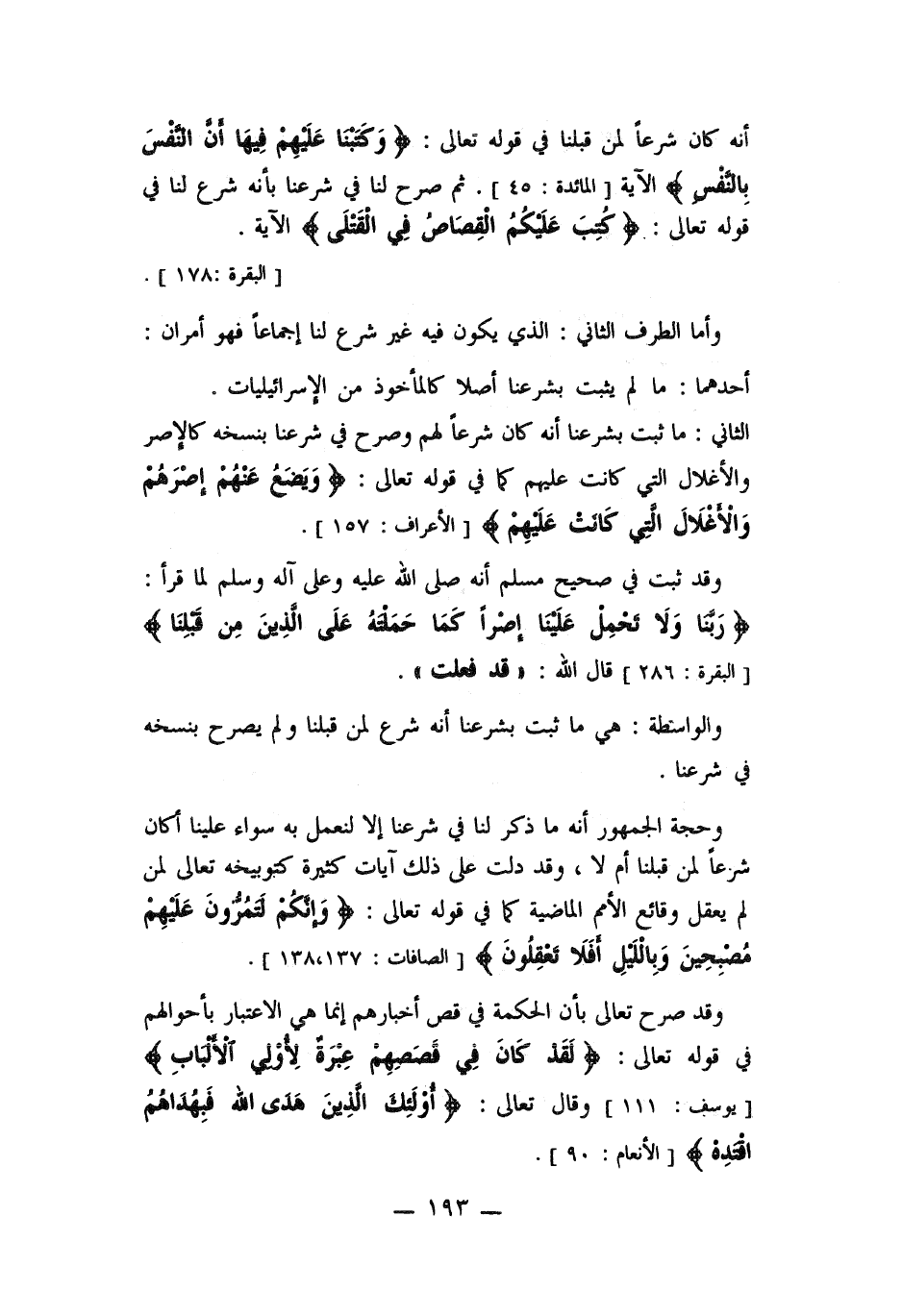 وحجة الجمهور أنه ما ذكر لنا في شرعنا الا لنعمل به سواء علينا أكان شرعاً لمن قبلنا أم لا , وقد دلت على ذلك آيات كثيرة كتوبيخه تعالى لمن لم يعقل وقائع الأمم الماضية كما في قوله تعالى: ((وإنكم لتمرون عليهم مصبحين وبالليل أفلا يعقلون)) .