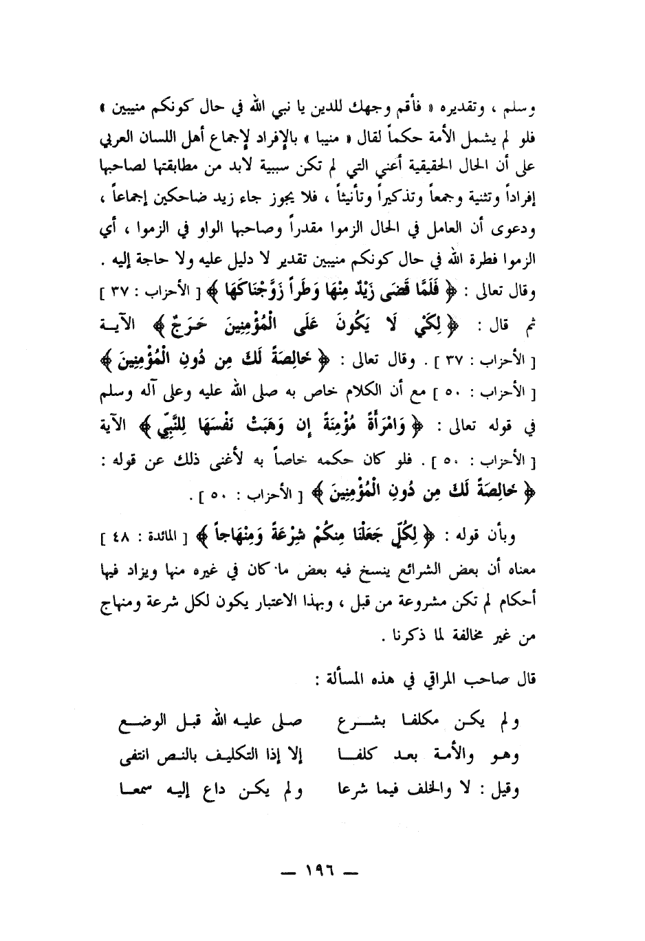 كونكم منيبين)) فلو لم يشمل الأمة حكماً لقال ((منيبا)) بالإفراد لإجماع أهل اللسان العربي على أن الحال الحقيقية أعني التي لم تكن سببية لا بد من مطابقتها لصاحبها إفراداً وتثنية وجمعاً وتذكيراً وتأنيثاً , فلا يجوز جاء زيد ضاحكين اجماعاً , ودعوى أن العامل في الحال ألزموا مقدراً وصاحبها الواو في ألزموا , أي ألزموا فطرة الله في حال كونكم منيبين تقدير لا دليل عليه ولا حاجة إليه. وقال تعالى: ((فلما قضى زيد منها وطرا زوجناكها)) ثم قال: ((لكي لا يكون على المؤمنين حرج)) الآية.