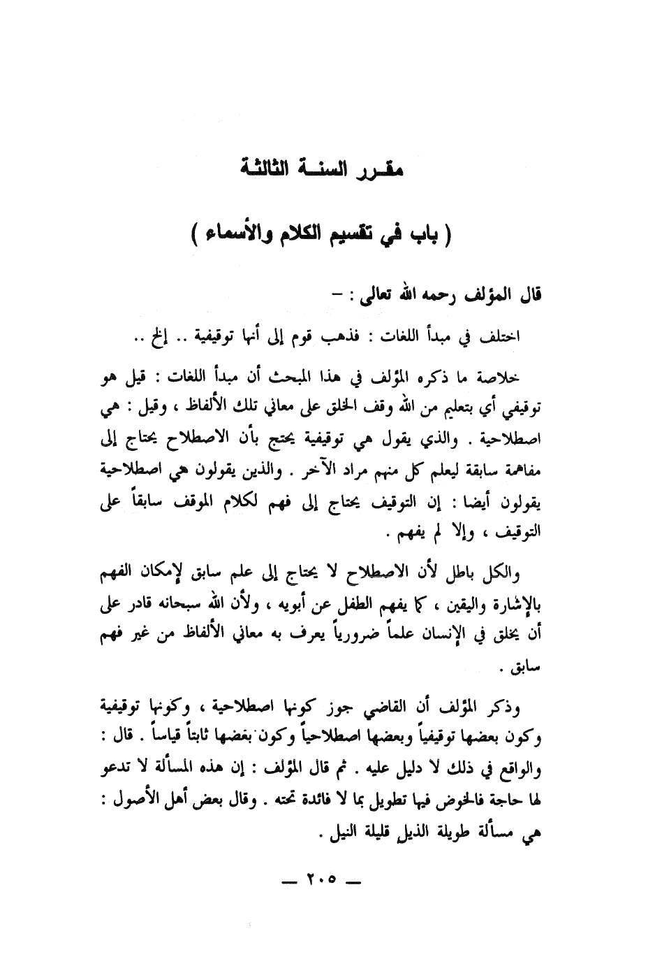 خلاصة ما ذكره المؤلف في هذا المبحث أن مبدأ اللغات: قيل هو توقيفي أي بتعليم من الله وقف الخلق على معاني تلك الألفاظ , وقيل: هي اصطلاحية. والذي يقول هي توقيفية يحتج بأن الاصطلاح يحتاج إلى مفاهمة سابقة ليعلم كل منهم مراد الآخر. والذين يقولون هي اصطلاحية يقولون أيضاً: ان التوقيف يحتاج إلى فهم لكلام الموقف سابقاً على التوقيف , والا لم يفهم.