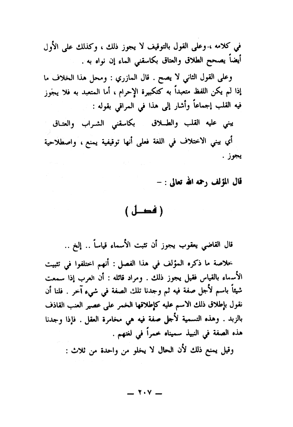 خلاصة ما ذكره المؤلف في هذا الفصل: أنهم اختلفوا في تثبيت الأسماء بالقياس فقيل يجوز ذلك. ومراد قائله: أن العرب إذا سمت شيئاً باسم لأجل صفة فيه ثم وجدنا تلك الصفة في شئ آخر. فلنا أن نقول بإطلاق ذلك الاسم عليه كإطلاقها الخمر على عصير العنب القاذف بالزبد. وهذه التسمية لأجل صفة فيه هي مخامرة العقل. فإذا وجدنا هذه الصفة في النبيذ سميناه خمراً في لغتهم.