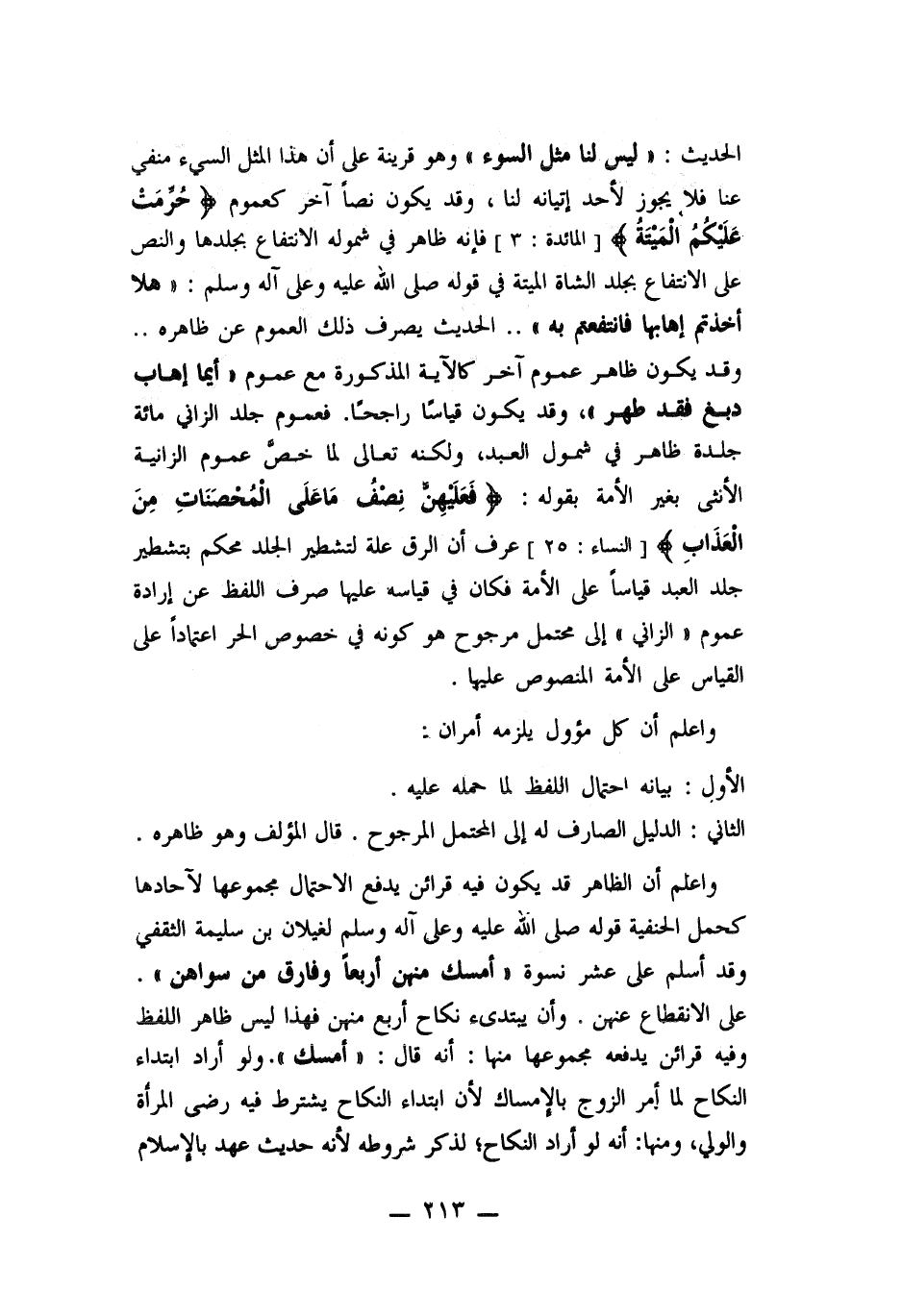 فعموم جلد الزاني مائة جلدة ظاهر في شمول العبد ولكنه صلى الله عليه وسلم لما خص عموم الزانية الأنثى بغير الأمة بقوله ((فعليهن نصف ما على المحصنات من العذاب)) عرف أن الرق على لتشطير الجلد محكم بتشطير جلد العبد قياساً على الأمة فكان في قياسه عليها صرف اللفظ عن إرادة عموم ((الزاني)) إلى محتمل مرجوح هو كونه في خصوص الحر اعتماداً على القياس على الأمة المنصوص عليها.