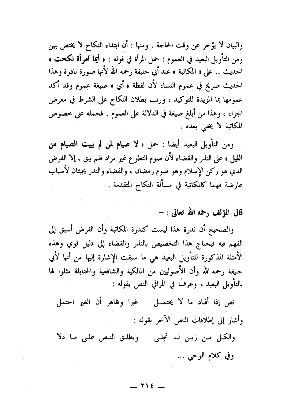 والبيان لا يؤخر عن وقت الحاجة. ومنها: أن ابتداء النكاح لا يختص بهن ومن التأويل البعيد في العموم: حمل المرأة في قوله: ((أيما امرأة نكحت)) الحديث.. على ((المكاتبة)) عند أبي حنيفة رحمه الله لأنها صورة نادرة وهذا الحديث صريح في عموم النساء لأن لفظه ((أي)) صيغة عموم وقد أكد عمومها بما المزيدة للتوكيد. ورتب بطلان النكاح على الشرط في معرض الجزاء , وهذا من أبلغ صيغة في الدلالة على العموم. فحمله على خصوص المكاتبة لا يخفي بعده.
