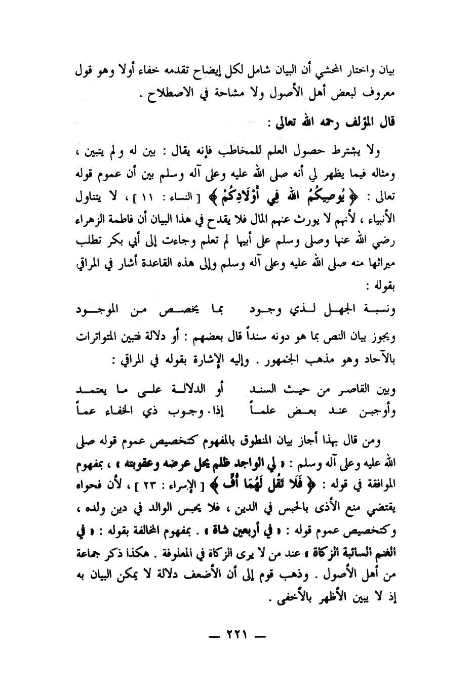 ولا يشترط حصول العلم للمخاطب فانه يقال: بين له ولم يتبين , ومثاله فيما يظهر لي أنه صلى الله عليه وسلم بين أن عموم قوله تعالى ((يوصيكم الله في أولادكم , لا يتناول الأنبياء , لأنهم لا يورث عنهم المال فلا يقدح في هذا البيان ان فاطمة الزهراء رضى الله عنها وصلى وسلم على أبيها لم تعلم به وجاءت إلى