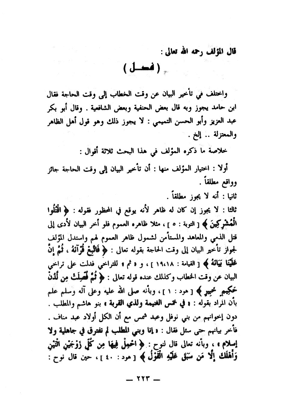 ثانياً: أنه لا يجوز مطلقاً. لا ان كان له ظاهر لأنه يوقع في المحظور فقوله: ((اقتلوا المشركين)) مثلا ظاهره العموم فلو أخر البيان لأدى إلى قتل الذمي والمعاهد والمستأمن لشمول ظاهر العموم لهم واستدل المؤلف لجواز تأخير البيان إلى وقت الحاجة بقوله تعالى: ((فاتبع قرآنه , ثم ان علينا بيانه)) .