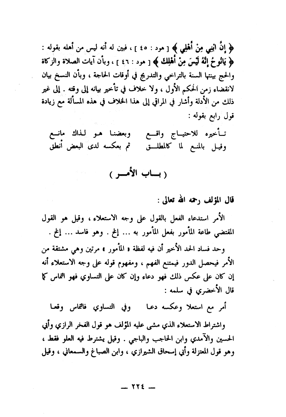 الأمر استدعاء الفعل بالقول على وجه الاستعلاء , وقيل هو القول المقتضي طاعة المأمور بفعل المأمور به ... الخ. وهو فاسد ... الخ.