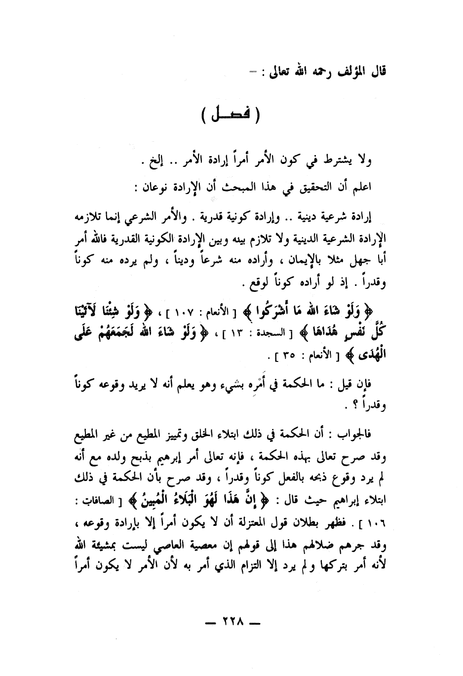 إرادة شرعية دينية ... وارادة كونية قدرية. والأمر الشرعي انما تلازمه الإرادة الشرعية الدينية ولا تلازم بينه وبين الإرادة الكونية القدرية فالله أمر أبا جهل مثلا بالإيمان , وأراده منه شرعاً وديناً. ولم يرده منه كوناً وقدراً. اذ لو أراده كوناً لوقع. ((ولو شاء الله ما أشركوا)) . ((ولو شئنا لآتينا كل نفس هداها)) . ولو شاء الله لجمعهم على الهدى.