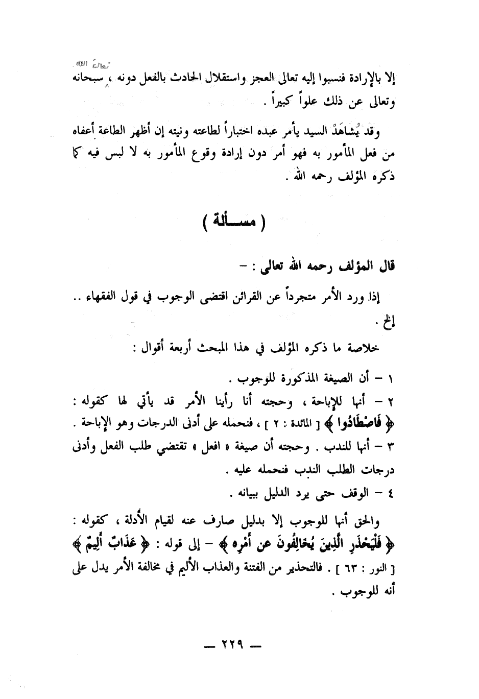 4- الوقوف أنها للوجوب الا بدليل صارف عنه لقيام الأدلة , كقوله ((فليحذر الذين يخالفون عن أمره)) إلى قوله: ((عذاب أليم)) فالتحذير من الفتنة والعذاب الأليم في مخالفة المر يدل على أنه للوجوب.