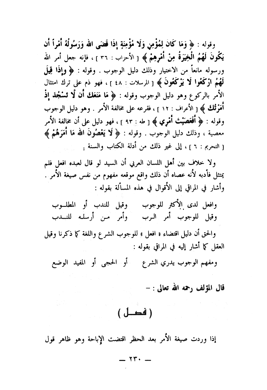 وقوله: ((واذا قيل لهم اركعوا لا يركعون)) فهو ذم على ترك امتثال الأمر بالركوع وهو دليل الوجوب وقوله: ((ما منعك أن لا تسجد اذ أمرتك)) فقرعه على مخالفة الأمر. وهو دليل الوجوب وقوله: ((أفعصيت أمري)) فهو دليل على أن مخالفة الأمر معصية. وذلك دليل الوجوب. وقوله: ((لا يعصون الله ما أمرهم)) إلى غير ذلك من أدلة الكتاب والسنة. ولا خلاف بين أهل اللسان العربي أن السيد لو قال لعبده افعل فلم يمتثل فأدبه لأنه عصاه أنه ذلك واقع موقعه مفهوم من نفس صيغة الأمر.