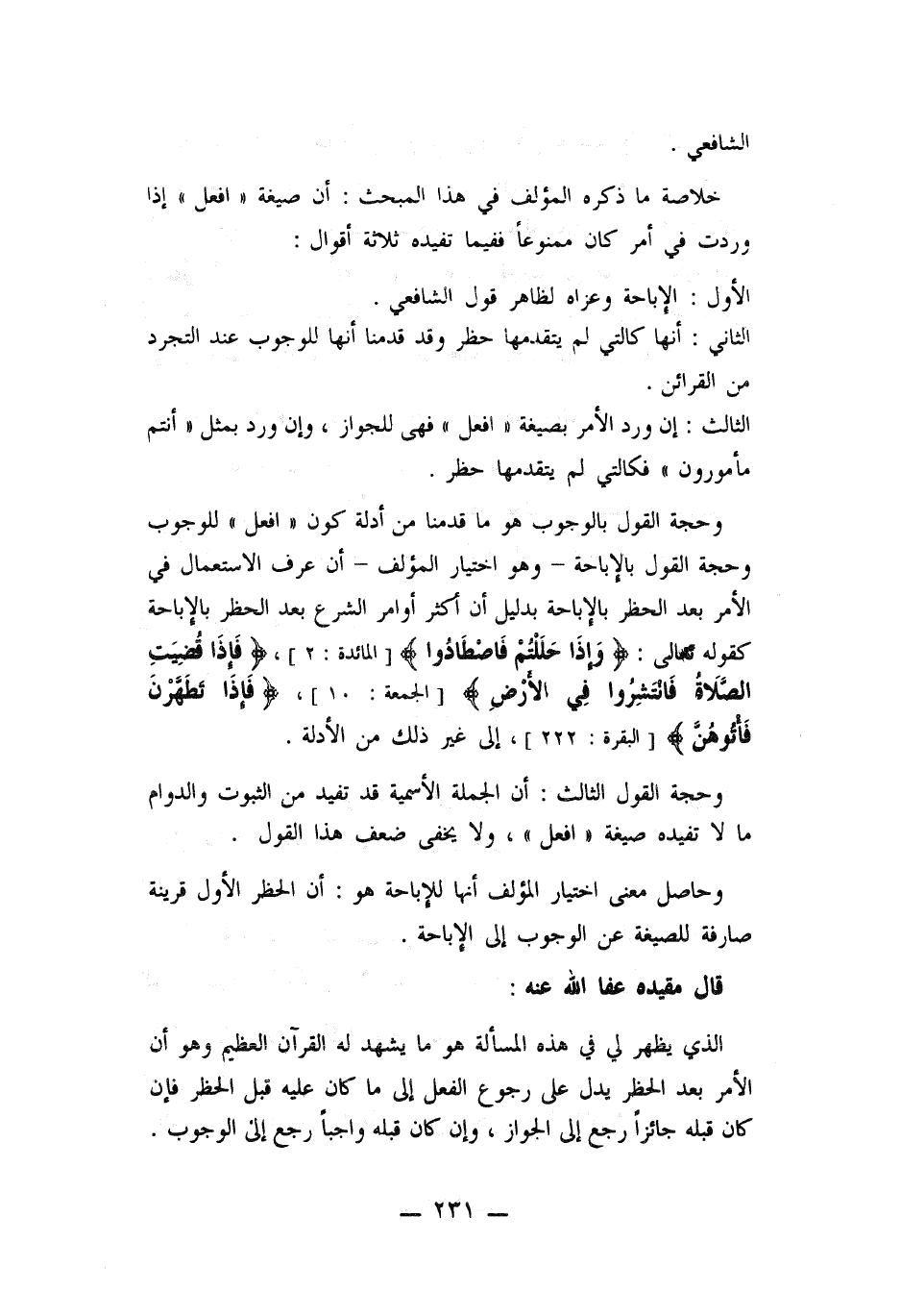 خلاصة ما ذكره المؤلف في هذا المبحث: أن صيغة ((افعل)) اذا وردت في أمر كان ممنوعاً ففيما تفيده ثلاثة أقوال: