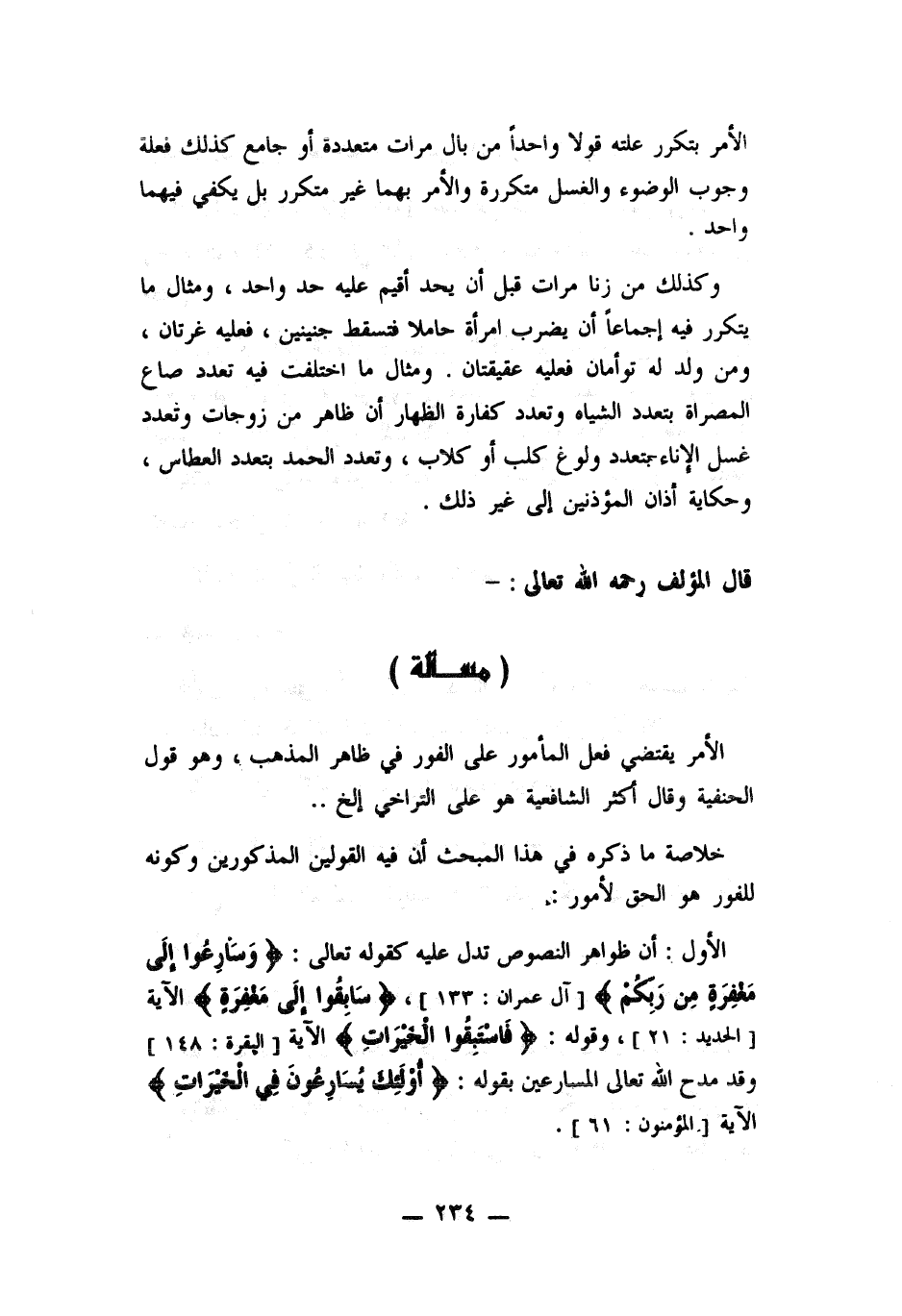 الأمر يقتضي فعل المأمور على الفور في ظاهر المذهب , وهو قول الحنفية وقال أكثر الشافعية هو على التراخي الخ ...