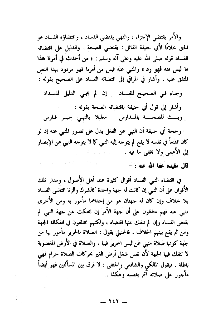 في اقتضاء النهي الفساد أقوال كثيرة عن أهل الأصول , ومدار تلك الأقوال على أن النهي ان كانت له جهة واحدة كالشرك والزنا اقتضى الفساد بلا خلاف وان كان له جهتان هو من إحداهما مأمور به ومن الأخرى منهي عنه فهم متفقون على أن جهة الأمر ان انفكت عن جهة انهي لم يقتض الفساد وان لم تنفك عنها اقتضاه , ولكنهم يختلفون في انفكاك الجهة ومن ثم يقع بينهم الخلاف , فالحنبلي يقول: الصلاة بالحرير مأمور بها من جهة كونها صلاة منهي عن لبس الحرير فيها والصلاة في الأرض المغصوبة لا تنفك فيها الجهة لأن نفس شغل أرض الغير