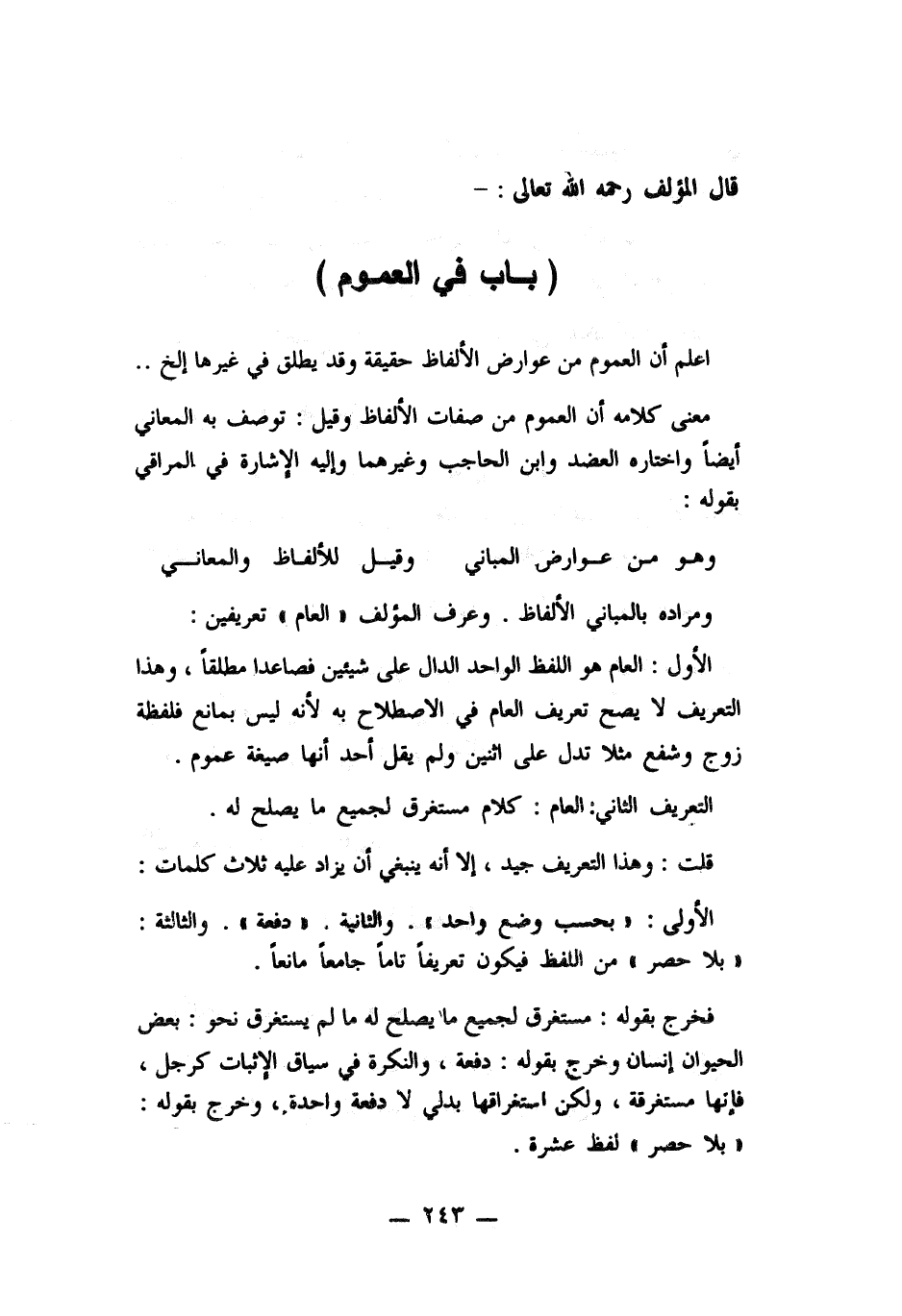 ومراده بالمباني الألفاظ. وعرف المؤلف ((العام)) تعريفين: