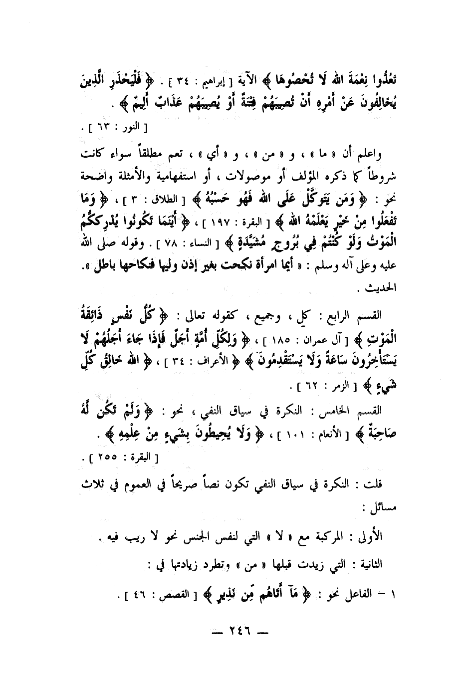 القسم الخامس: النكرة في سياق النفي , نحو ولم تكن له صاحبة , ولا يحيطون بشيء من علمه.