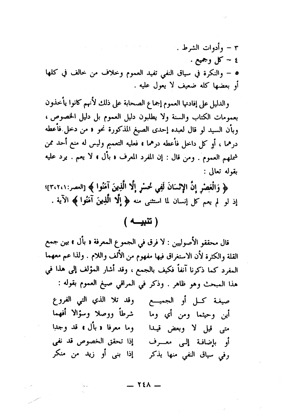 3- والنكرة في سياق النفي تفيد العموم وخلاف من خالف في كلها أو بعضها كله ضعيف لا يعول عليه.