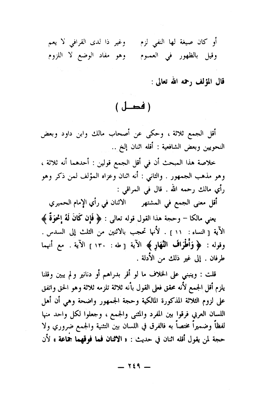 أقل الجمع ثلاثة , وحكى عن أصحاب مالك وابن داوود وبعض النحويين وبعض الشافعية: أقلة اثنان الخ..