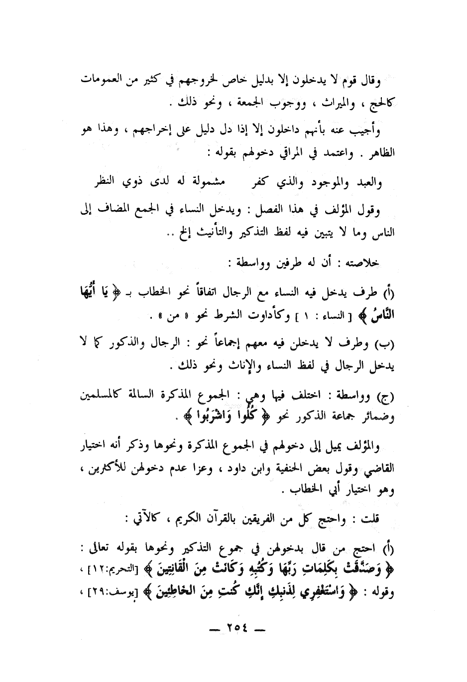 (أ) احتج من قال بدخولهن في جموع التذكير ونحوها بقوله تعالى: ((وصدقت بكلمات ربها وكتبه وكانت من القانتين)) وقوله: ((واستغفري لذنبك انك كنت من الخاطئين))