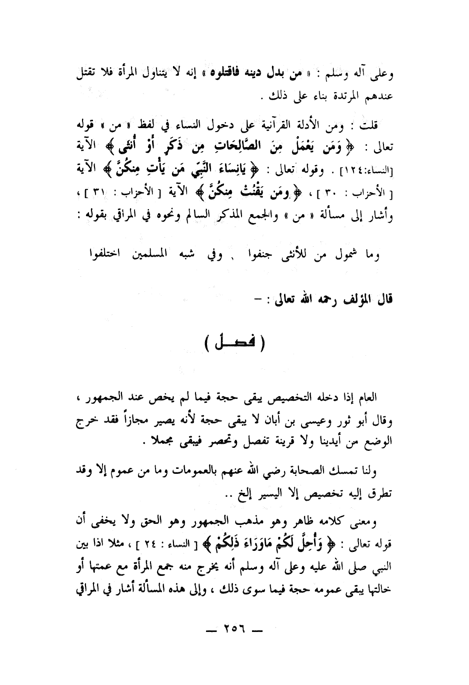 قلت: ومن الأدلة القرآنة على دخول النساء في لفظ ((من)) قوله تعالى: ((ومن يعمل من الصالحات من ذكر أو انثى)) الآية. وقوله تعالى: ((يا نساء النبي من يأت منكن)) الآية. ((ومن يقنت منكن)) الآية. وأشار إلى مسألة ((من)) ) والجمع المذكر السالم ونحوه في المراقي بقوله: