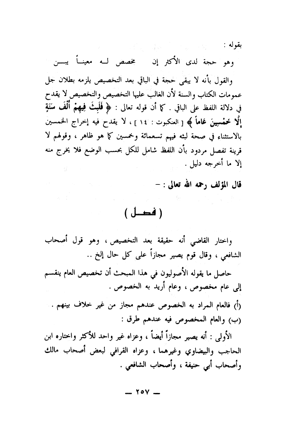 والقول بأنه لا يبقى حجة في الباقي بعد التخصيص يلزمه بطلان جل عمومات الكتاب والسنة لأن الغالب عليها التخصيص والتخصيص لا يقدح في دلالة اللفظ على الباقي. كما أن قوله تعالى: ((فلبث فيهم ألف سنة الا خمسين عاماً)) لا يقدح فيه إخراج الخمسين بالاستثناء في صحة لبثه فيهم تسعمائة وخمسين كما هو ظاهر. وقولهم لا قرينة تفصل مردود بأن اللفظ شامل للكل بحسب الوضع فلا يخرج منه الا ما أخرجه دليل.