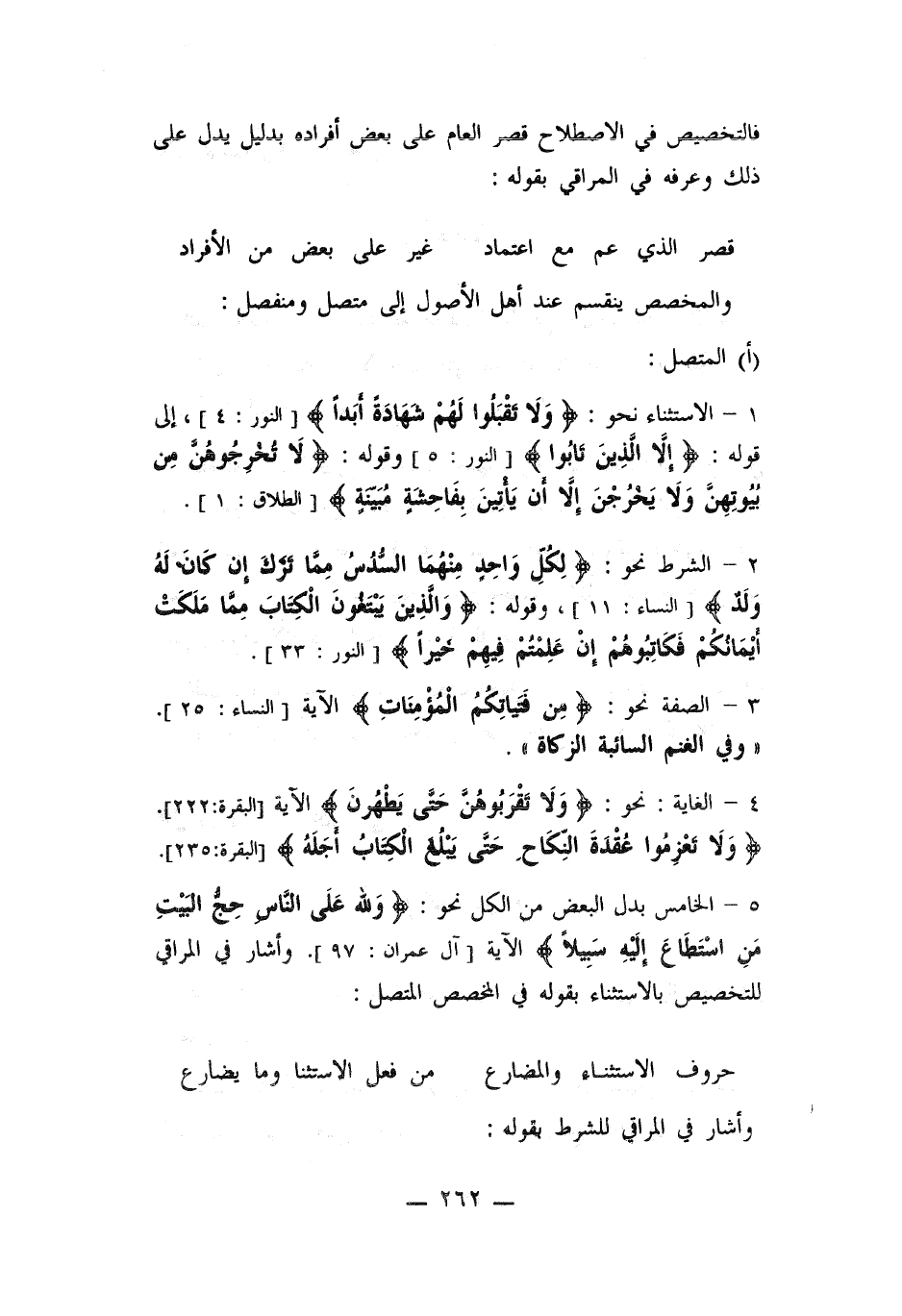 1- الاستثناء نحو: ((ولا تقبلوا لهم شهادة أبداً)) إلى قوله: ((إلا الذين تابوا)) وقوله: ((ولا تخرجوهن من بيوتهن ولا يخرجن إلا أن يأتين بفاحشة مبينة)) .