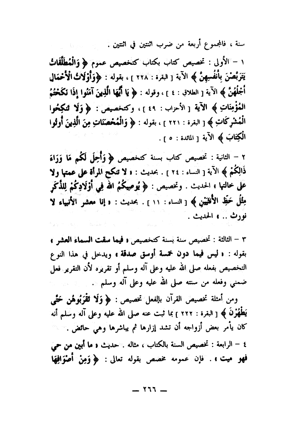 1- الأولى: تخصيص كتبا بكتاب كتخصيص عموم ((والمطلقات يتربصن بأنفسهن)) الآية. , بقوله: ((وألات الأجمال أجلهن)) الآية. وقوله: ((يا أيها الذين آمنوا اذا نكحتم المؤمنات)) الآية. وكتخصيص: ((ولا تنكحوا المشركات)) بقوله: ((والمحصنات من الذين أوتوا الكتاب)) الآية.