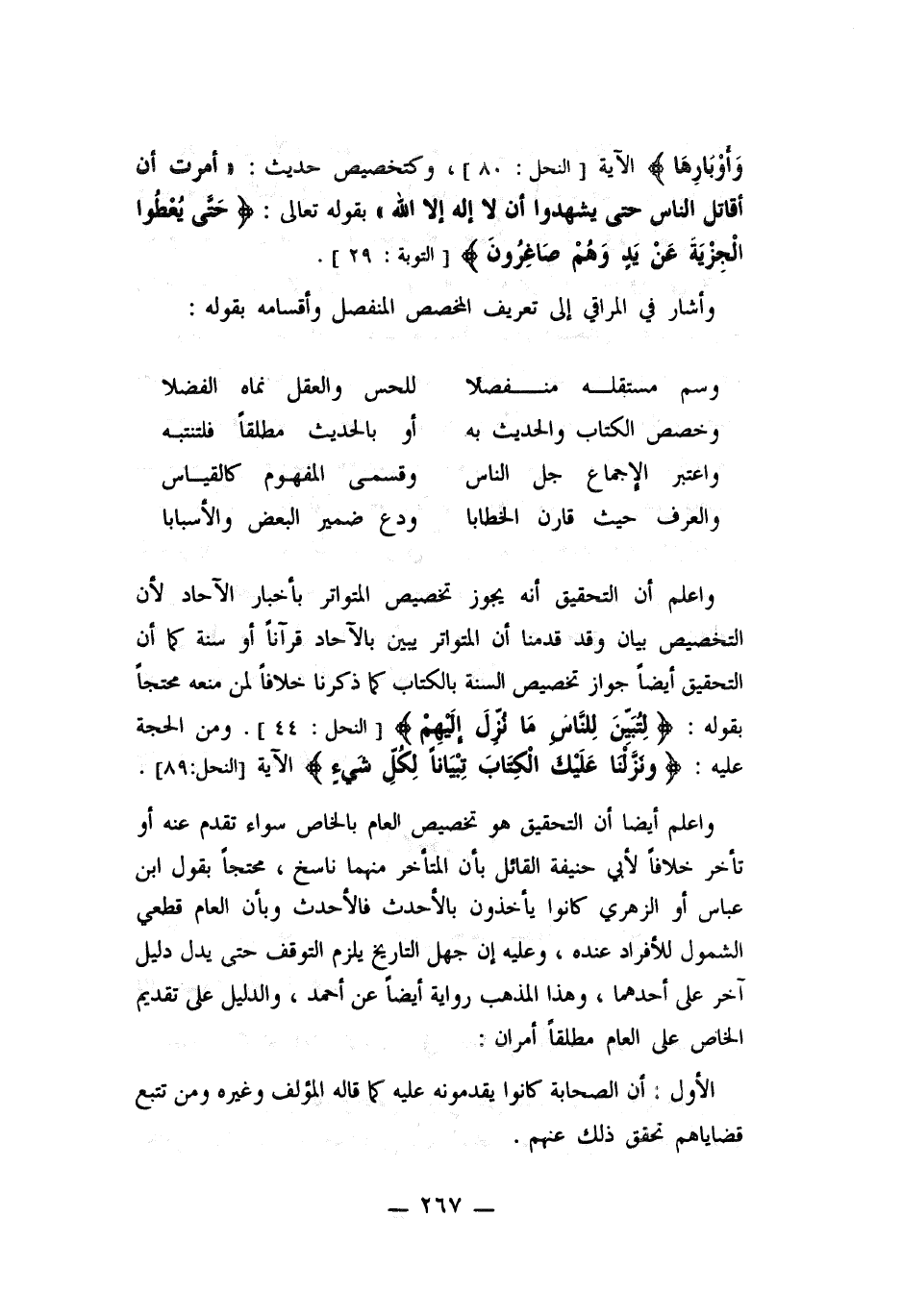 وأوبارها)) الآية. وكتخصيص حديث: أمرت أن أقاتل الناس حتى يشهدوا (أن لا اله الا الله) بقوله تعالى: ((حتى يعطوا الجزية عن يد وهو صاغرون)) . وأشار في المراقي إلى تعريف المخصص المنفصل وأقسامه بوله: