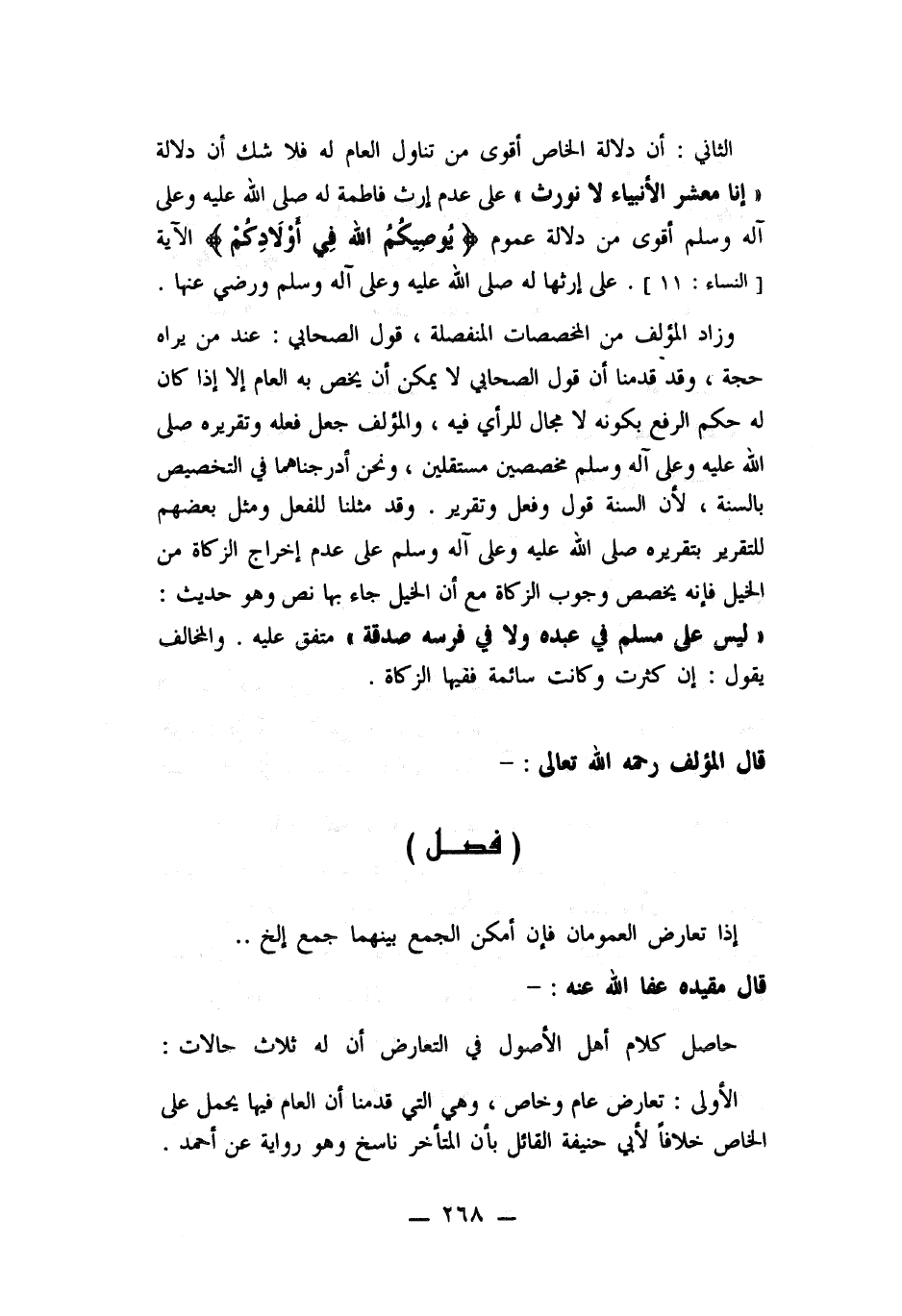 الثاني: أن دلالة الخاصة أقوى من تناولهم العام له فلا شك أن دلالة ((انا معاشر الأنبياء لا نورث)) على عدم أرث فاطمه له صلى الله عليه وسلم أقوى من دلالة عموم ((يوصيكم الله في أولادكم)) الآية. على ارثها له صلى الله عليه وسلم ورضي عنها.