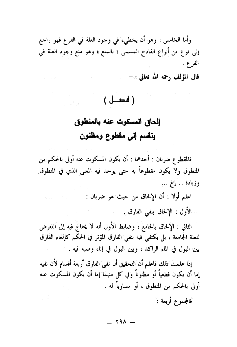 إذا علمت ذلك فاعلم أن التحقيق أن نفي الفارق أربعة أقسام لأن نفيه إما أن يكون قطعياً أو مظنوناً وفي كل منهما أما أن يكون المسكوت عنه أولى بالحكم من المنطوق، أو مساوياً له.