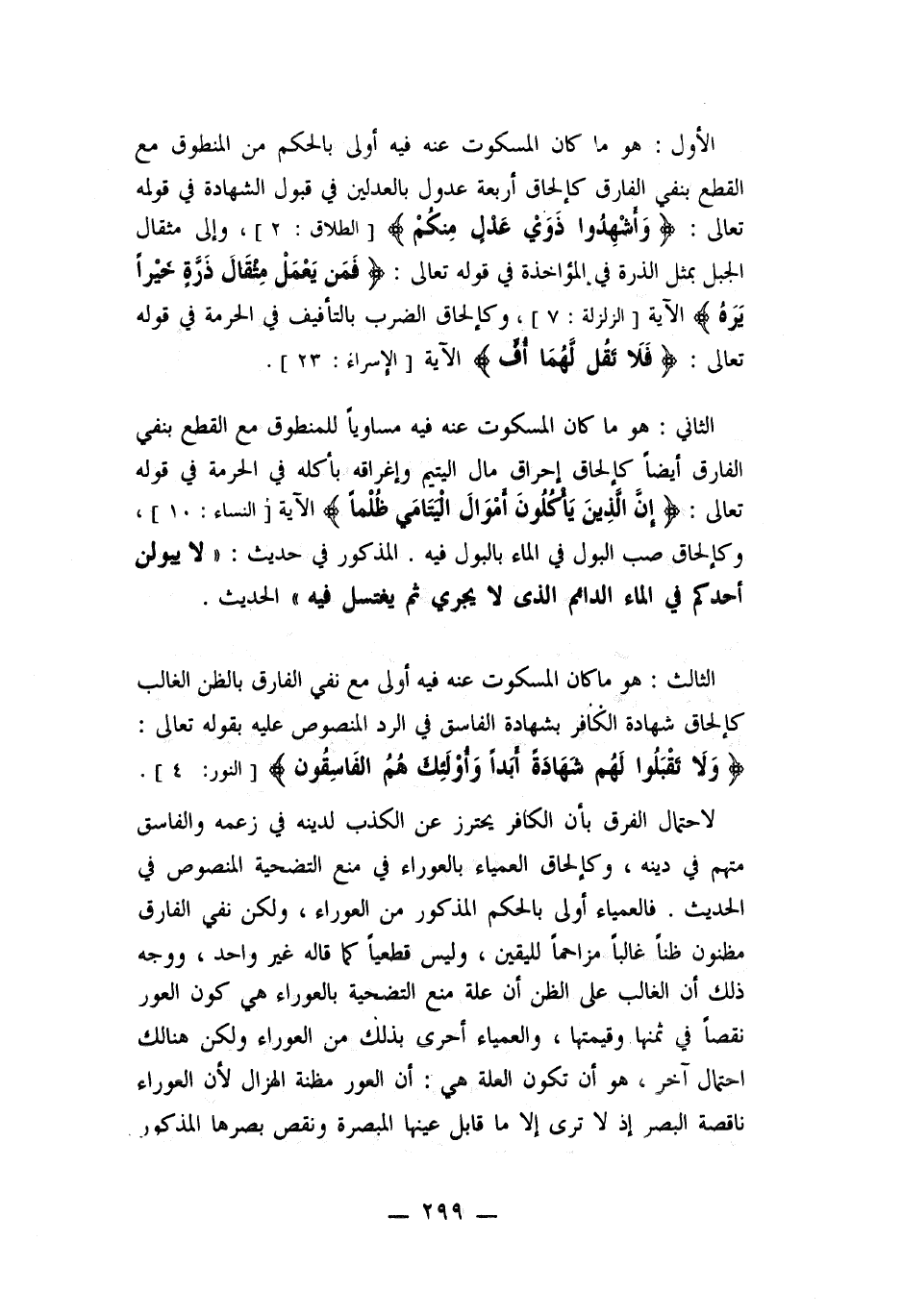 الأول: هو ما كان المسكوت عنه فيه أولى بالحكم من المنطوق مع القطع ينفي الفارق كالحاق أربعة عدول بالعدلين في قبول الشهادة في قوله تعالى: " واشهدوا ذوي عدل منكم " والى مثقال الجبل بمثل الذرة في المؤاخذة في قوله تعالى: " فمن يعمل مثقال ذرة خيراً يره " الآية.