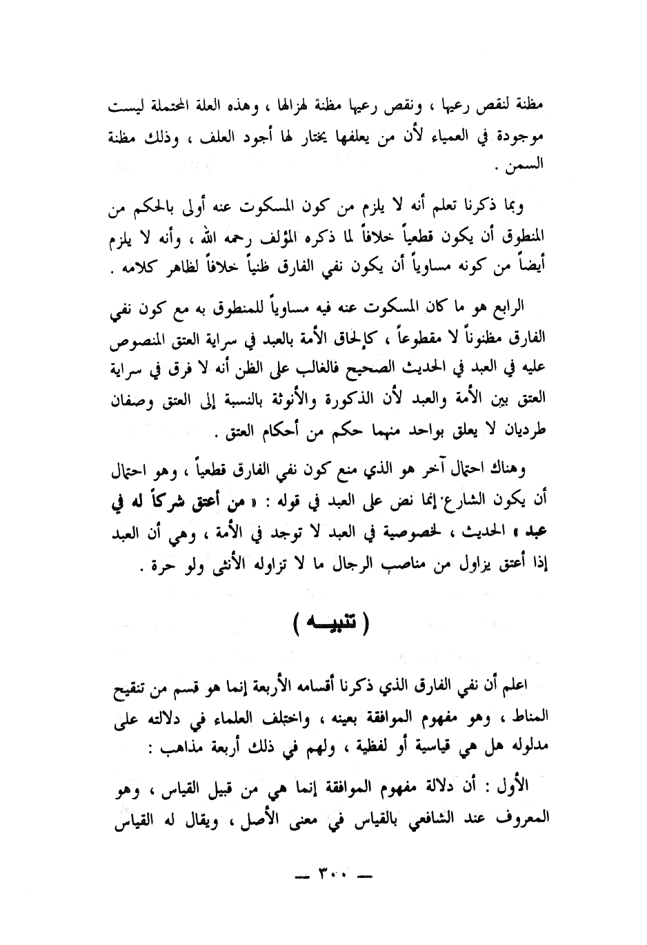 الرابع: هو ما كان المسكوت عنه فيه مساويا للمنطوق به مع كون نفي الفارق مظنونا لا مقطوعا، كالحاق الأمة بالعبد في سراية العتق المنصوص عليه في العبد في الحديث الصحيح فالغالب على الظن أنه لا فرق في سراية العتق بين الأمة والعبد لأن الذكورة والأنوثة بالنسبة إلى العتق وصفان
